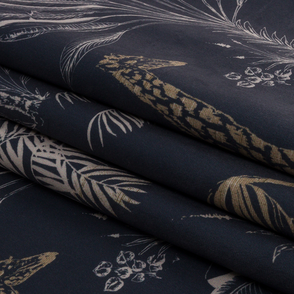 Cheetahs and zebras and giraffes—oh my, this British Imported Midnight Savannah Scene Printed Polyester Velvet is a wild nighttime display of safari life. Jungle animals graze in harmony over a dark blueish-gray flatland. Velvety to the touch with a plain beige reverse, it features a malleable drape and no stretch. Design full-length curtains and long valances with eye-catching embroidered trim, or fashion light upholstery projects like headboards with studs, pillows, and more. Opaque on its own, a lining can be used for sun protection in drapery projects if desired.