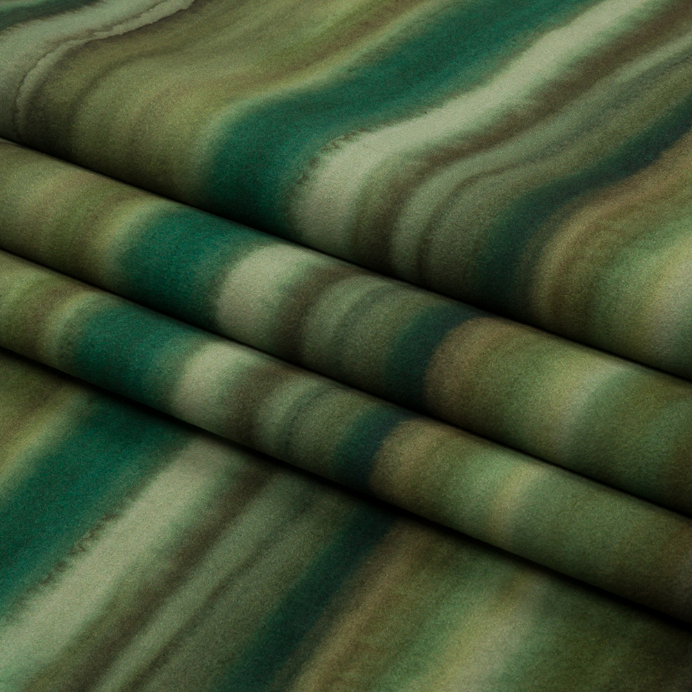 Bring a lush forest wonderland into your home with our British Imported Olive Painterly Stripes Polyester Velvet. Mossy stripes of different shades of green look and feel like the cool, padded forest floor. Velvety to the touch with a tactile beige reverse, it features a malleable drape and a heavy-weight. Design full-length curtains and long valances with eye-catching embroidered trim, or fashion light upholstery projects like headboards with studs, pillows, window seat covers, and more. Opaque on its own, a lining can be used for sun protection in drapery projects if desired.Please note: Although the overall width of this fabric is 57", the usable printed area is only 54" wide.