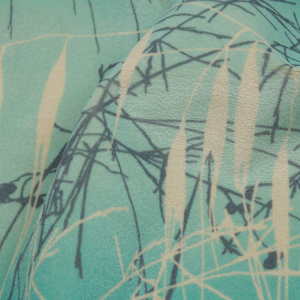 Add color and pattern to your home with this British Imported Verdigris Meadow Grass Ombre Printed Polyester Velvet. Tall grass and brambles find their home under an everchanging sky. The velvet background, sliding from turquoise to pale blue, brings peace to this overgrown meadow. It features a tactile beige backing and a heavy, malleable drape, perfect for all home designs. Create floor-length curtains and short valances with eye-catching embroidered trim, or upholster headboards, pillows, bench seat covers, and more. Opaque on its own, a lining can be used for sun protection in drapery projects if desired.Please note: Although the overall width of this fabric is 57", the usable printed area is only 54" wide.