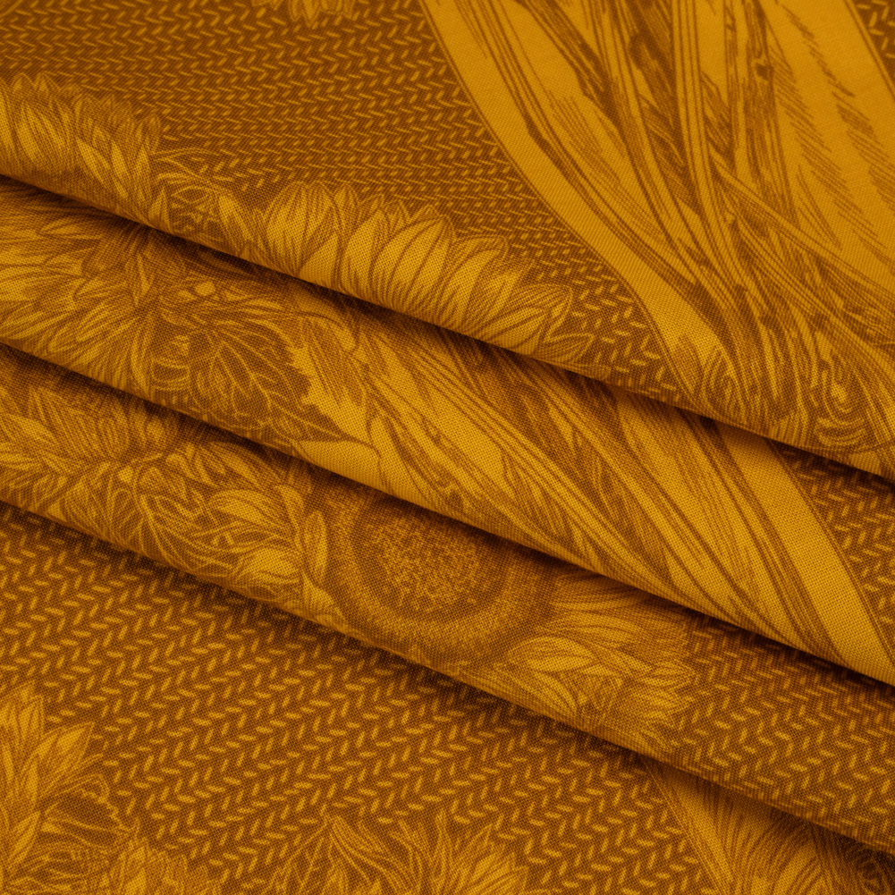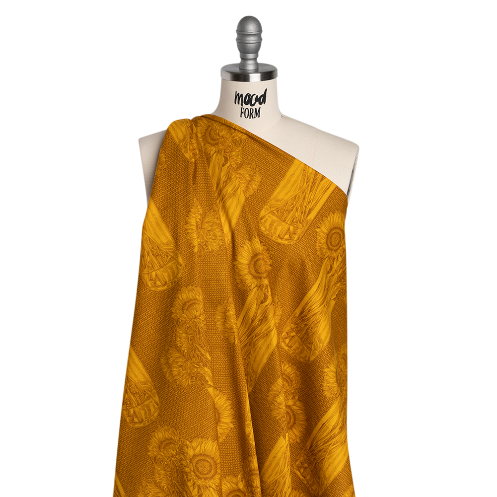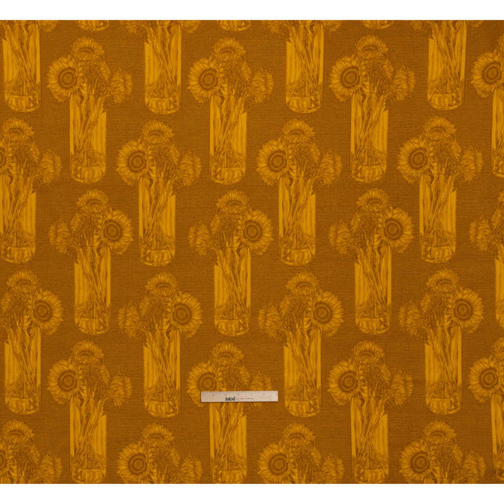 The glow of a late summer night is captured atop this Saffron Sunflowers Floral Printed Quilting Cotton by Anna Maria Textiles—featuring a smooth hand and supple drape.Suggested Projects: Dresses, Shirts, Jackets, Quilts, Light Home DecorContent: 100% CottonStretch: NoneOpacity: Slightly TranslucentA striking two-tone composition of saffron and brown sunflowers rests gracefully in a clear vase, set against a bold, chevron-inspired backdrop—an artful blend of elegance and modern flair. With a smooth hand, supple drape, and no stretch, this fabric is crafted for intricate quilt work—a stable weave and silky finish are perfect for anything from classic piecework and wholecloth quilting to appliqués and art quilts to English paper piecing—yet it effortlessly lends itself to lightweight home décor, craft, and fashion projects, too.Whether you’re stitching up airy shift dresses, sweet patchwork skirts, or crisp button-downs and tailored shorts, this fabric captures the gentle joy of open fields, spring air, and countryside strolls—where wildflowers sway, birdsong lingers, and the sun filters softly through the trees. Boasting a slight translucence, it’s best paired with a lining for added opacity and a polished finish.
