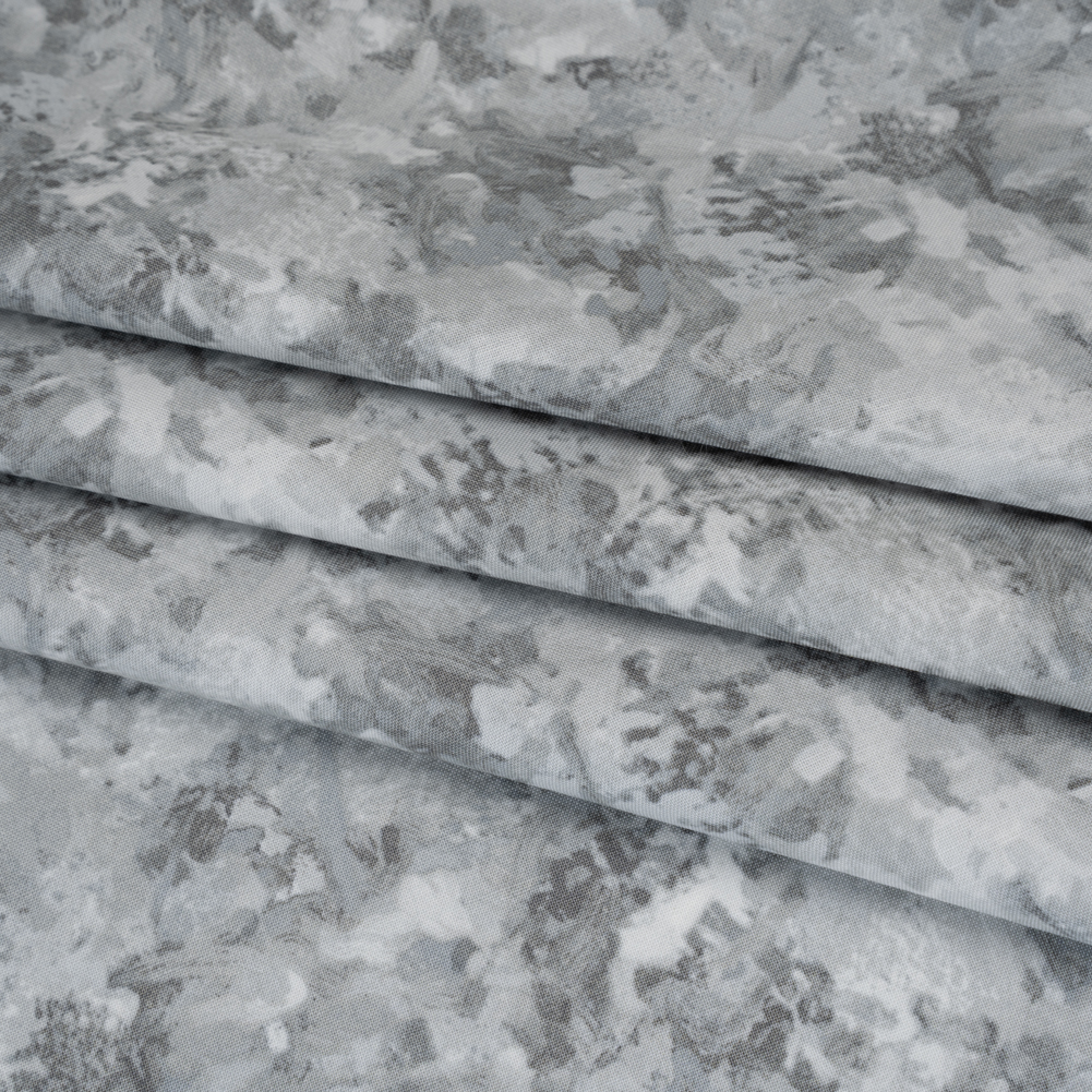This Mineral Painterly Abstract Printed Quilting Cotton is sure to be in miner-all of your creative visions—featuring a smooth hand and supple drape.Suggested Projects: Dresses, Shirts, Jackets, Quilts, Light Home DecorContent: 100% CottonStretch: NoneOpacity: Slightly TranslucentGaze upon the abstract swirls of gray and white paint strokes—each one a brush of possibility, inviting you to find the masterpiece hidden within. With a smooth hand, supple drape, and no stretch, this fabric is crafted for intricate quilt work—a stable weave and silky finish are perfect for anything from classic piecework and wholecloth quilting to appliqués and art quilts to English paper piecing—yet it effortlessly lends itself to lightweight home décor, craft, and fashion projects, too.Whether you’re designing breezy shift dresses, gathered patchwork skirts, or crisp button-downs and shorts, this fabric brings a touch of elegance to every stitch—or dream bigger with crisp button-up and pleated skirt sets or sharply tailored jackets and trousers, perfect for a day at the country club. Slightly translucent, a lining is recommended for added opacity and a refined finish.