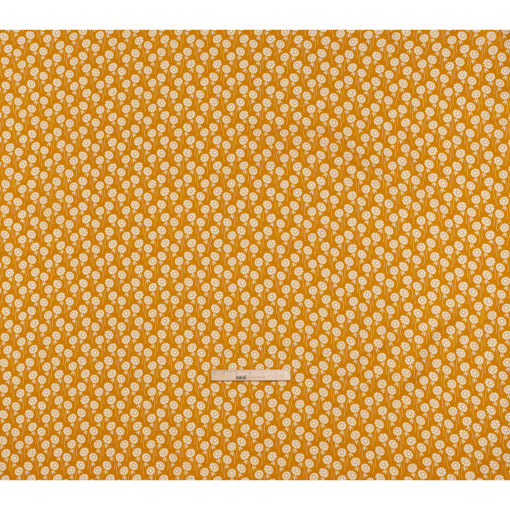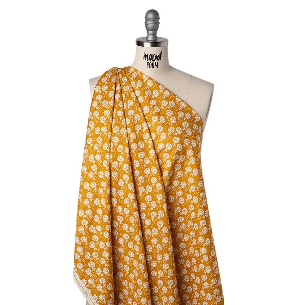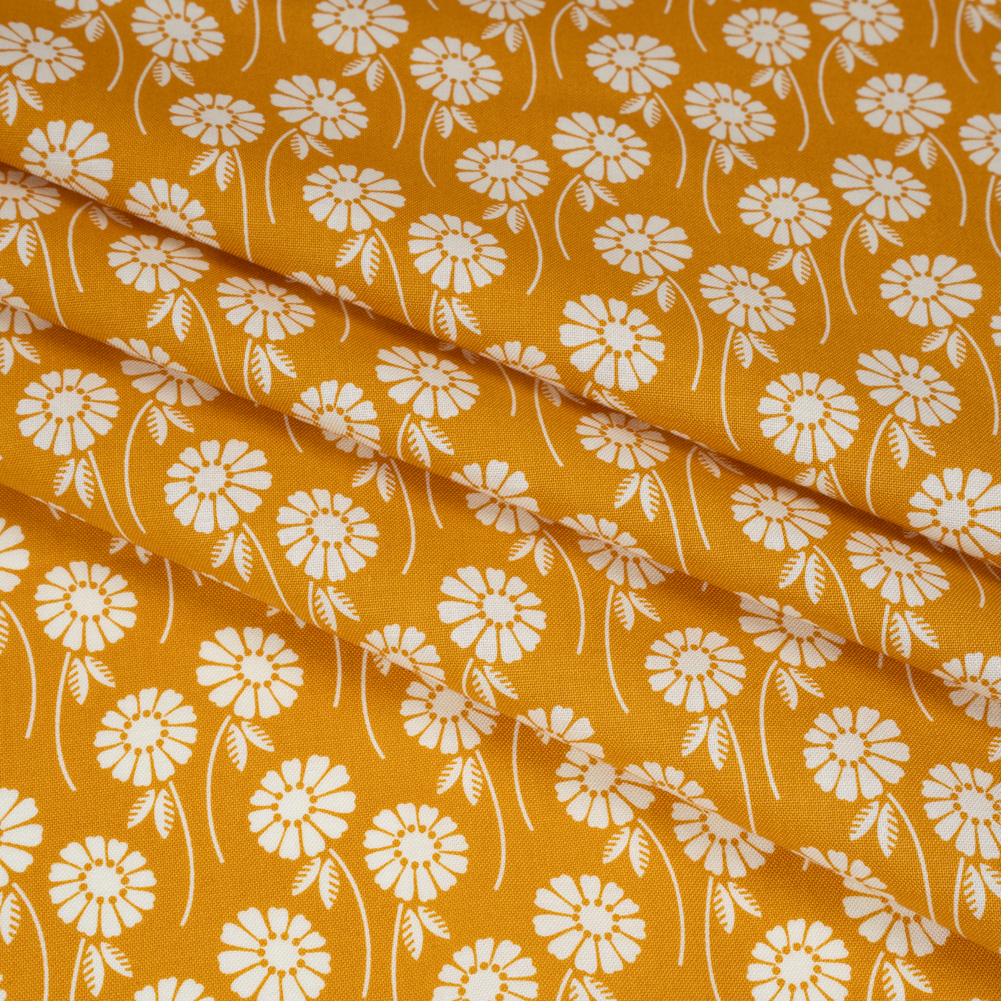 This Butterscotch Upsy Daisy Floral Printed Quilting Cotton is sure to serve your sweet tooth—featuring a smooth hand and supple drape.Suggested Projects: Skirts, Shirts, Quilts, Light Home DecorContent: 100% CottonStretch: NoneOpacity: Slightly TranslucentDaisies drift and dance in cream against a butterscotch background. With a smooth hand, supple drape, and no stretch, this fabric is crafted for easy, breezy quilt work—a stable weave and incredibly smooth, lightweight finish making it perfect for anything from classic piecework and wholecloth quilting to appliqués and art quilts to English paper piecing—yet it effortlessly lends itself to lightweight home décor, craft, and fashion projects, too.Whether you’re crafting breezy shift dresses, patchwork skirts full of movement, or relaxed camp shirts and shorts, this fabric channels the essence of summer—warm breezes, sun-drenched days, and easy elegance in every stitch. With its slight translucence, a lining is recommended to enhance opacity and give your creations a polished, refined finish.
