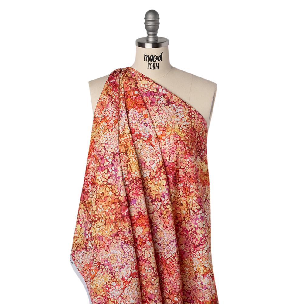 The hues of a tropical sunset are captured within this Tahitian Sunset Bubbles Printed Quilting Cotton—featuring a smooth hand and supple drape.