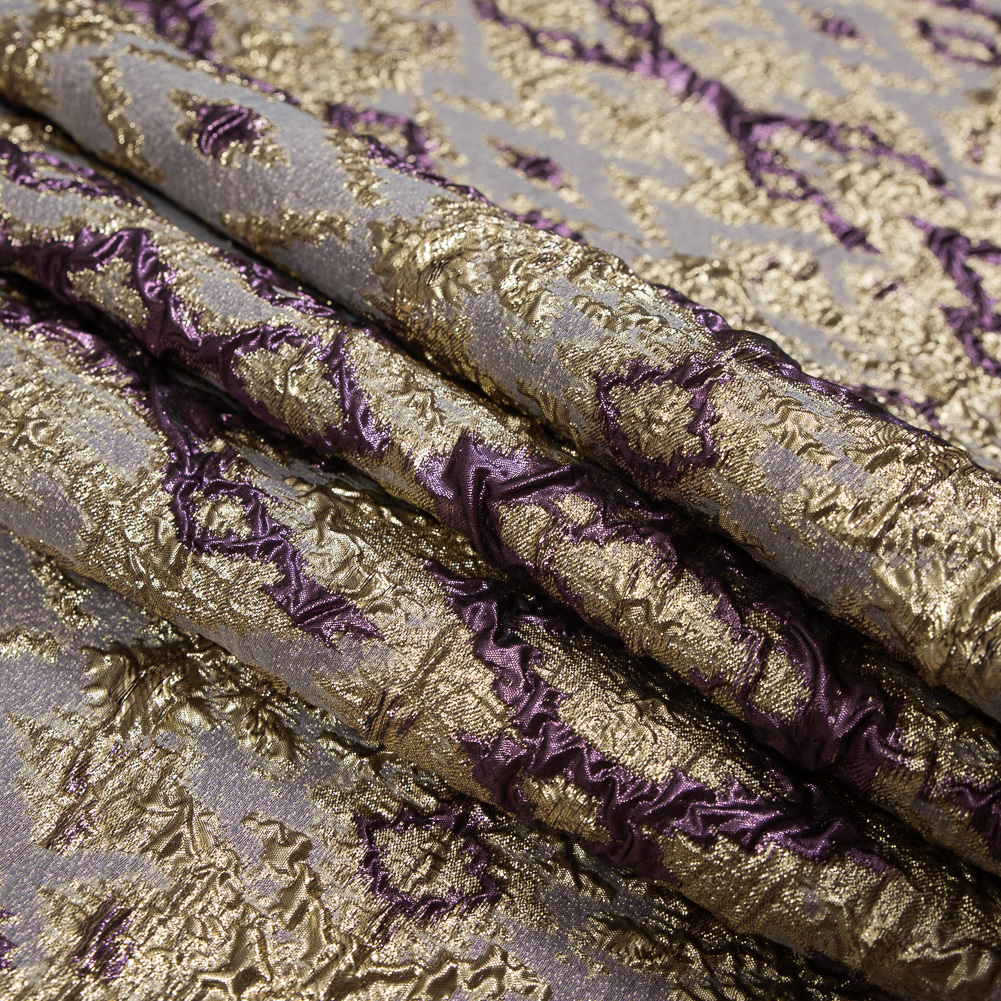 Presenting our Purple and Gold Luxury Geometric Metallic Brocade. A wavy, faux-diamond pattern in purple and gold dominates this fabric, giving it a zany, electric look fit for the runway. The raised surface of the metallic brocade really allows the ornate design to pop. Thin and lightweight, this fabric comes with a crisp hand and a billowy drape, making it a fantastic choice for drop-dead gorgeous cocktail dresses, evening gowns, and more. Opaque, a lining may be added for comfort.