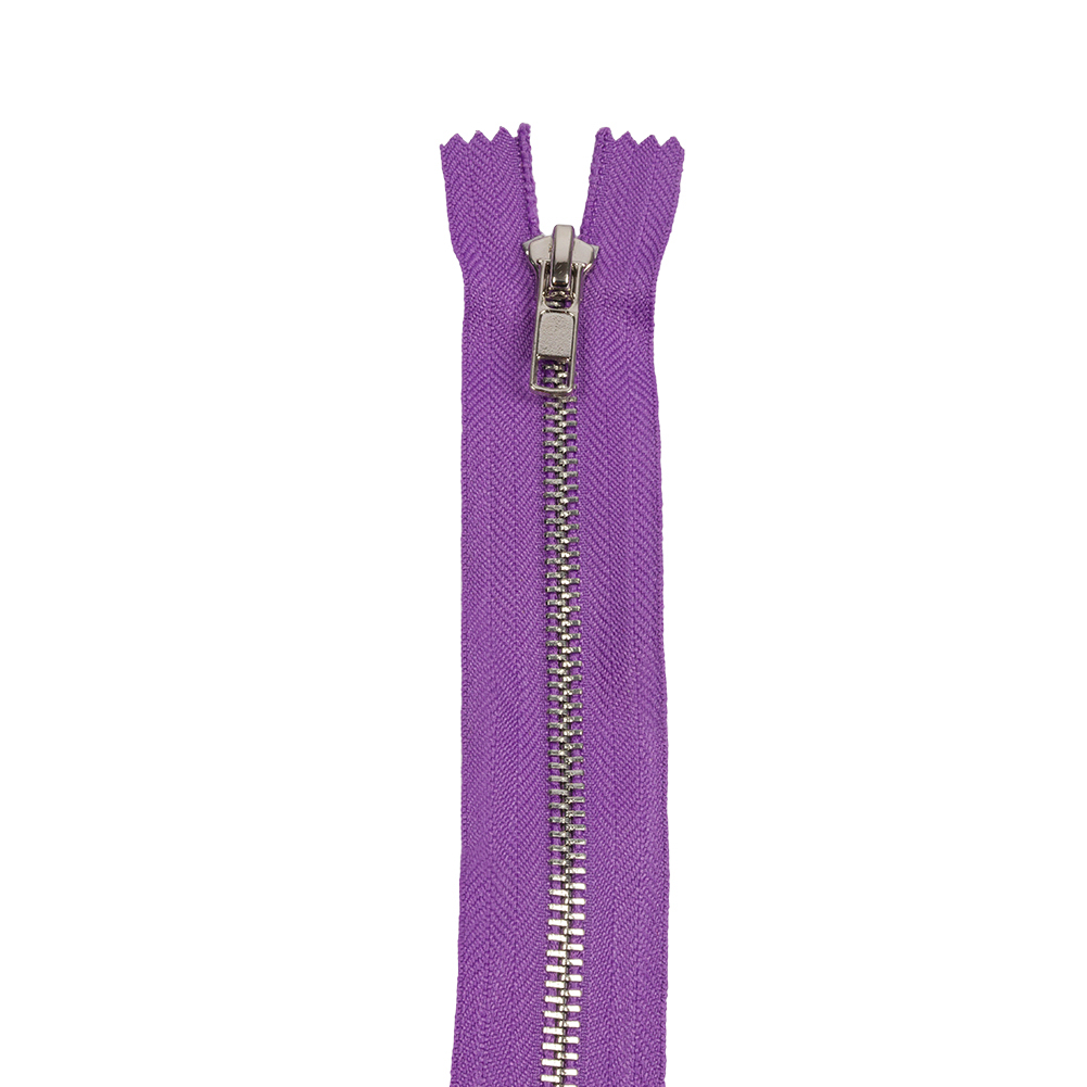 Crush your next project with this Purple and Silver T5 Closed End Metal Zipper! Offered in a wide variety of colors, these 36-inch zippers invite your creativity to play with the small details of your projects. A purple zipper tape frames silver metal teeth, connecting at the end to create a durable, non-separating accessory for garments, accessories, and upholstery. Measuring 1¼ inches wide, use on pillows, seat cushions, large duffle bags, and more!