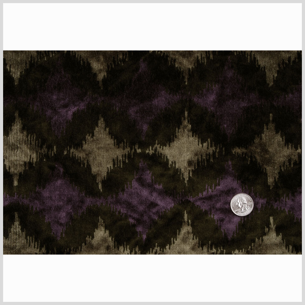 Dramatic upholstery-velvet in an ikat pattern of purple, light gray and black. Suitable for upholstery and other home decor applications.