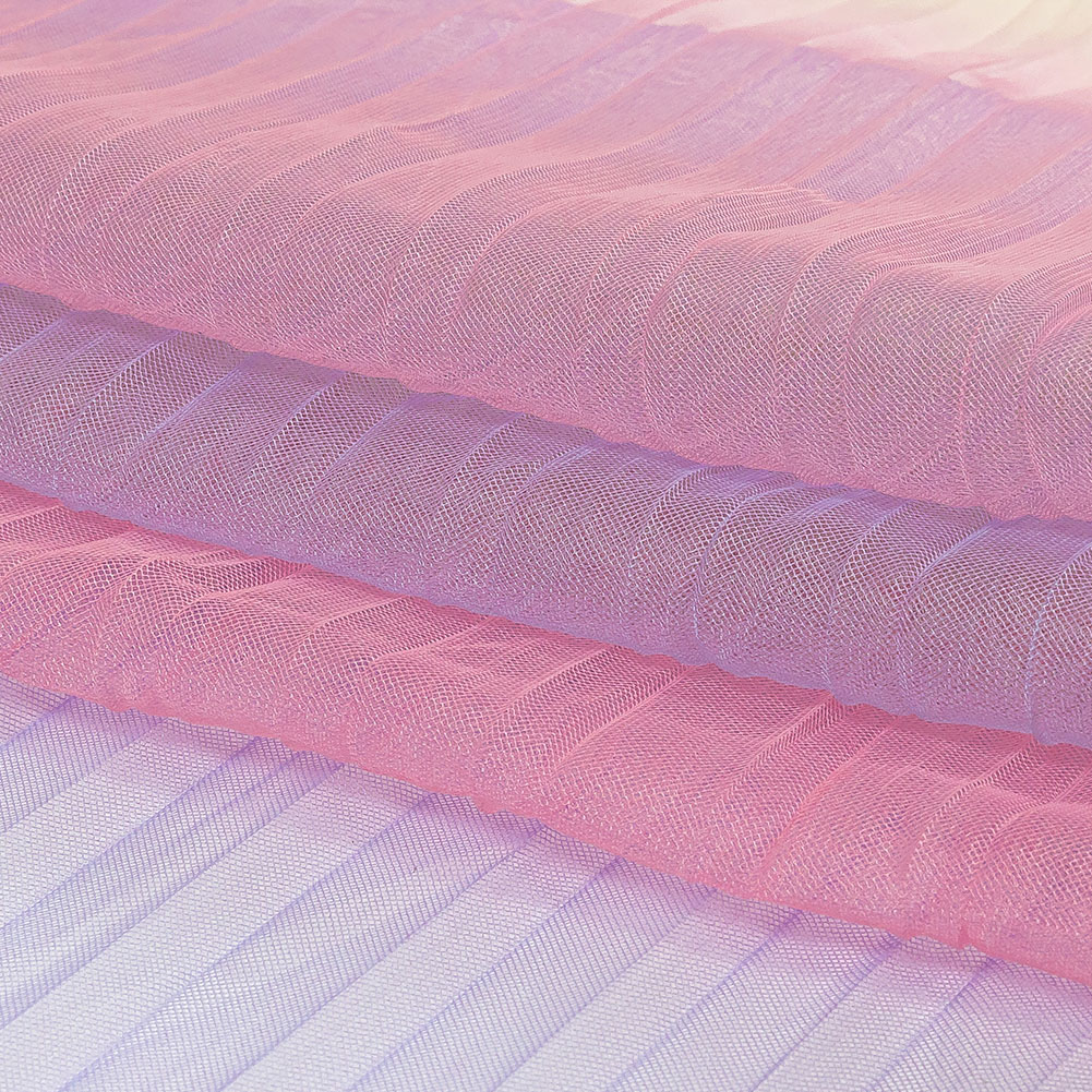 This Purple, Pink and Yellow Ombre Stripes Pleated Tulle is what dreams are made of! Pastel pink, light purple, and nearly-neon yellow stripes fade into each other running vertically over widthwise pleats, which give it a soft but textural hand. With an airy and springy, but still malleable drape, create pleated skirts, statement sleeves, and an array of dresses. Sheer in nature, lining or layering is recommended where opacity is desired.