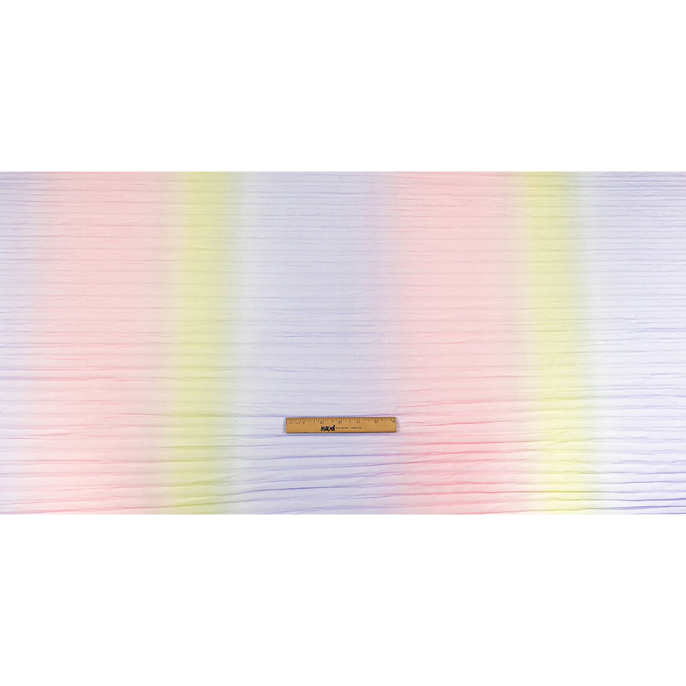 This Purple, Pink and Yellow Ombre Stripes Pleated Tulle is what dreams are made of! Pastel pink, light purple, and nearly-neon yellow stripes fade into each other running vertically over widthwise pleats, which give it a soft but textural hand.