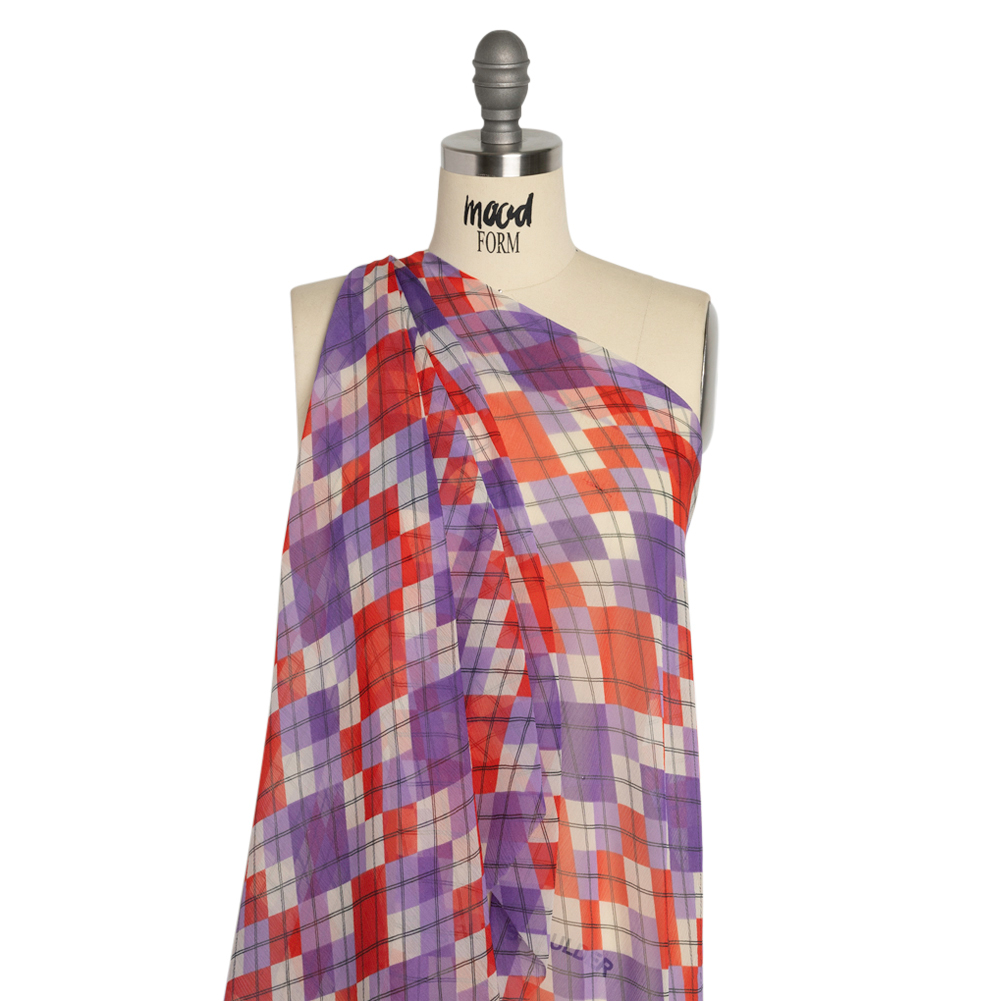 Elegance combines with tradition on this Purple, Red and Cream Argyle Crinkled Silk Chiffon. Cream, purple, and red diamonds of different sizes are the background for black crossing lines, bringing to life the dimensional argyle pattern that we all know and love.Romanticize any silhouette with silk chiffon’s sheer quality and airy drape. A soft yet slightly crinkled hand accompanies this ethereal fabric, inspiring floor-length gowns, dusters, blouses with ruffled sleeves, scarves, and more. A tip from our sewists: do not feel intimidated by sewing this delicate fabric; using a rotary cutter (or sharp scissors and sharp pins), fine needles, tight stitching, French seams, and patience, anyone can show up to a special occasion wearing a silk chiffon garment they created themselves!