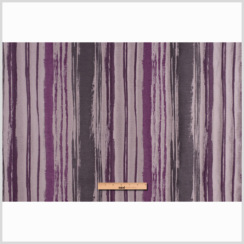 Brushstrokes of lavender, berry and cool blue-gray atop a gray background on this bold poly. The brushstrokes are slightly raised with just a hint of metallic luster. This medium-weight fabric is best for light upholstery and drapery.