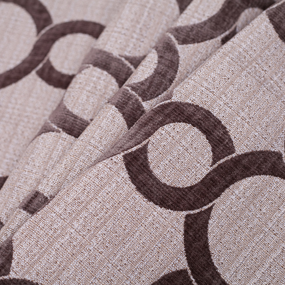 Flocked, velvety, quartz circles loop across the span of this upholstery fabric consisting of creped, tan and ivory, woven polyester yarns forming what looks like an uneven basket weave.