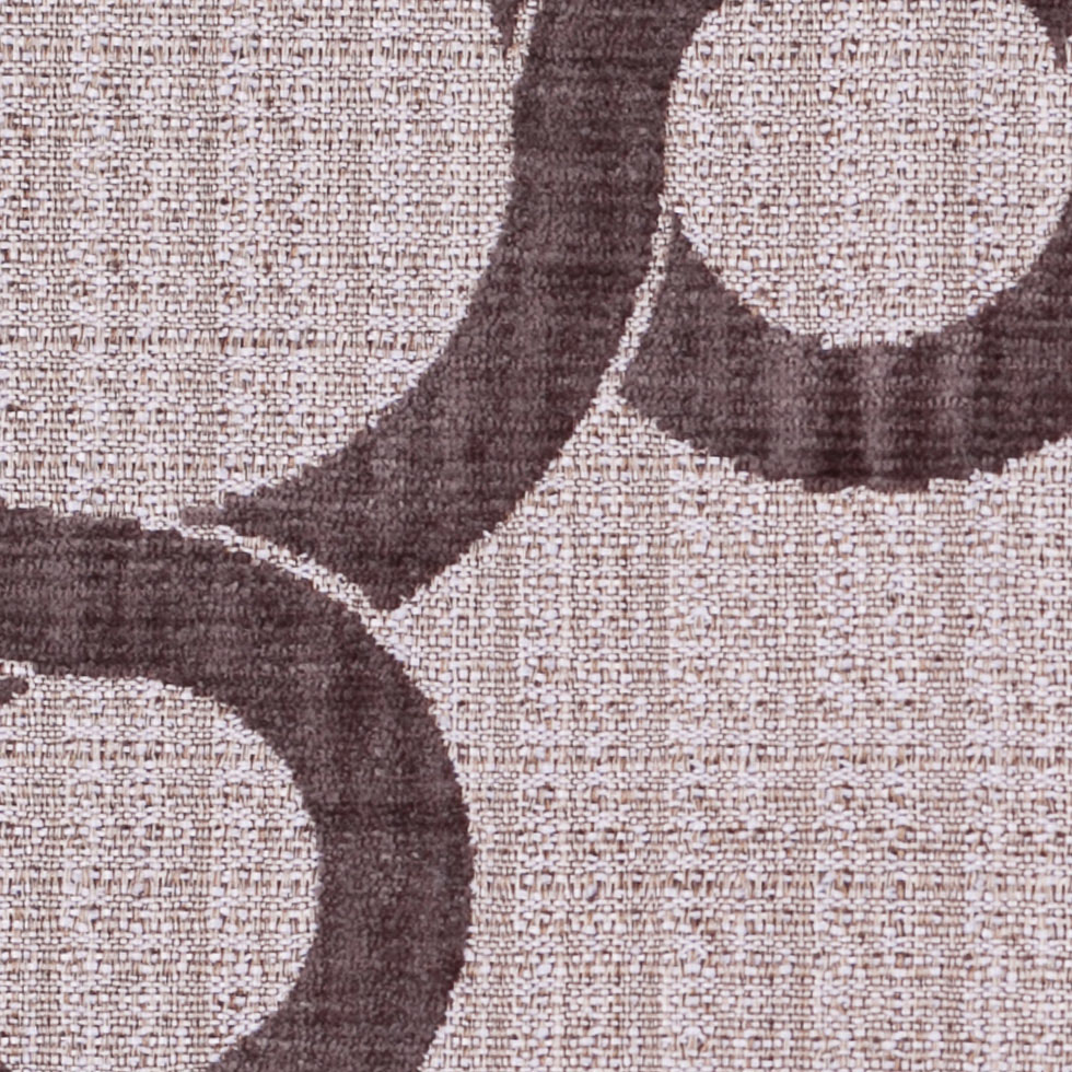 Flocked, velvety, quartz circles loop across the span of this upholstery fabric consisting of creped, tan and ivory, woven polyester yarns forming what looks like an uneven basket weave. Medium weight, this material would be great for upholstery and heavier drapery.