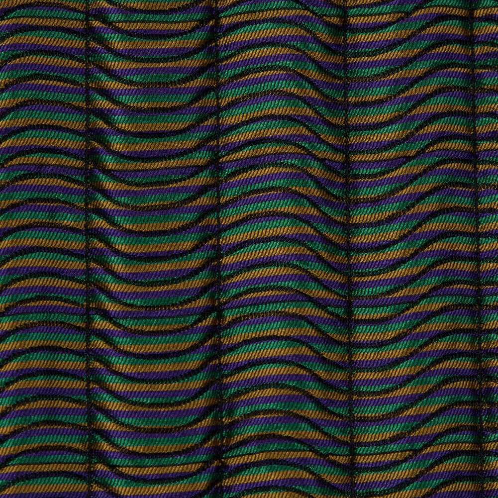 Let the good times roll with this Rainbow Quilted Polyester Woven. With a cascade of slightly luminous purples, greens and gold, a soft, textured hand, and a handsomely structured drape, the material it lends itself perfectly to use in an attention-grabbing quilted bomber, a colorful field jacket, or use it for countless costuming applications! The quilted construction of this fabric deems that a lining is not needed, as a lining is already attached to the wrong side.