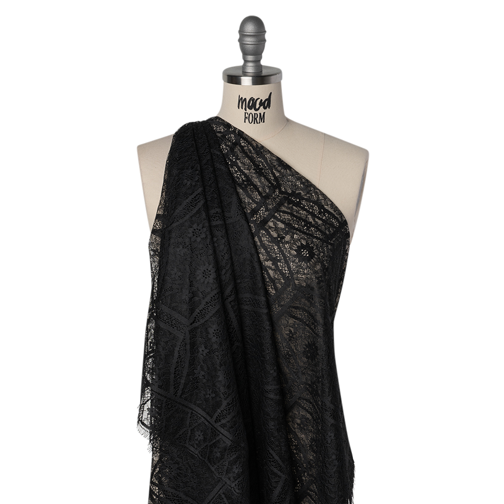 Gothic glamour unfurls across every inch of this Black Geometric and Floral Raschel Lace Panel with Finished Edges—featuring a soft, tactile hand and airy drape.Suggested Projects: Shirts, Skirts, Dresses, LingerieContent: 88% Nylon, 12% RayonStretch: NoneOpacity: SheerA geometric framework intertwines with flowers and vines, giving this black lace panel the appearance of an ornate fence gently overtaken by flourishing flora. An airy drape and soft, tactile hand make this raschel lace ideal for breezy silhouettes and flowing evening wear—with a luxurious finished edge making completing your projects that much easier. We envision waterfall skirts, breezy button-up shirts, overlays for flowing evening gowns and structured jackets, lingerie, and more! Sheer, due to the lace weave, use it as a panel or insert a lining for more opacity. Please note: This is a panel that measures 45” by 54”.