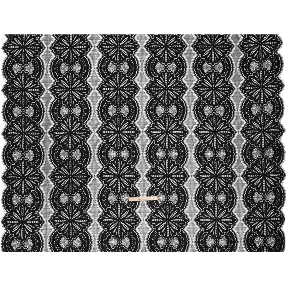 Raschel Lace Panel with Scalloped Finished Edges - Black Floral Medallion Stripes