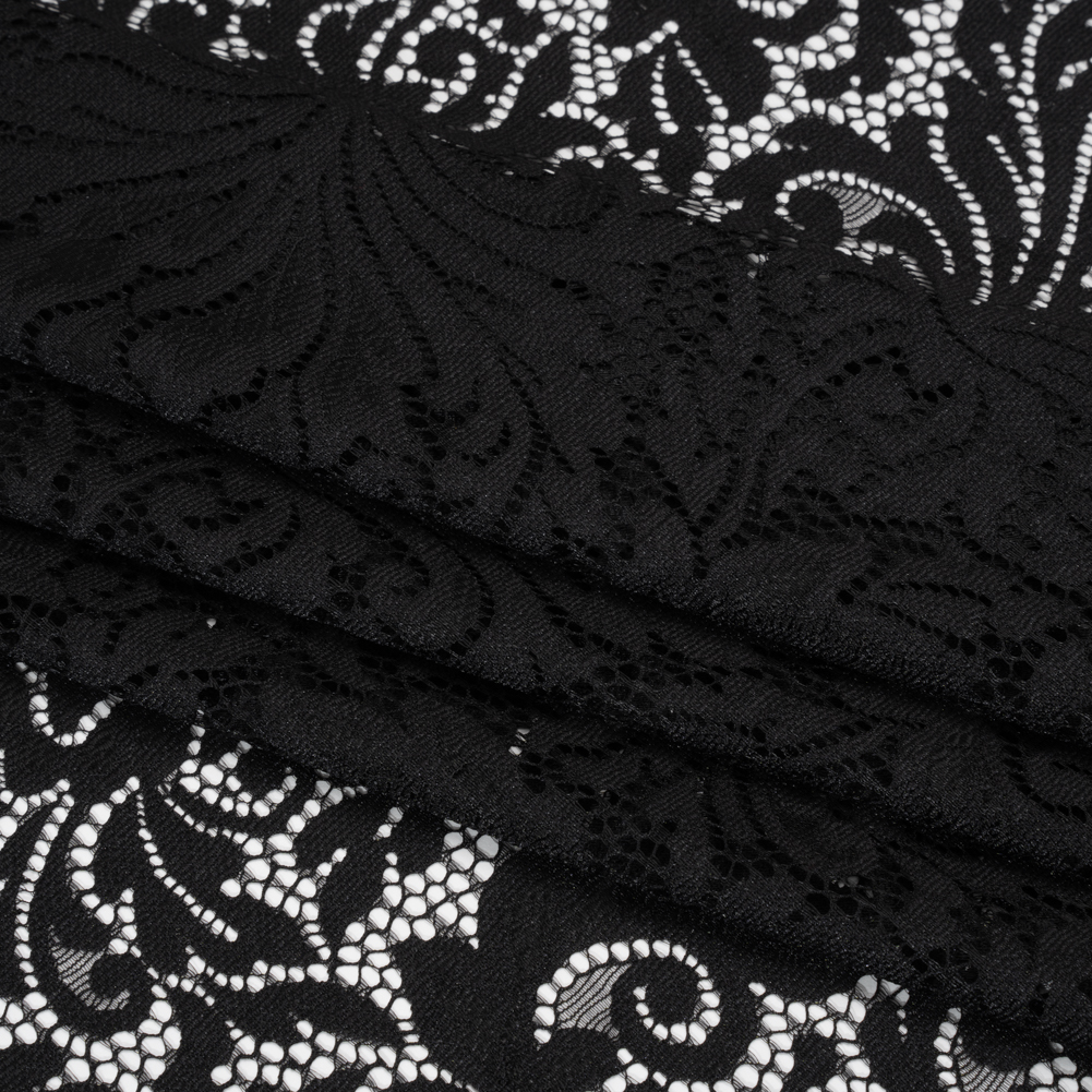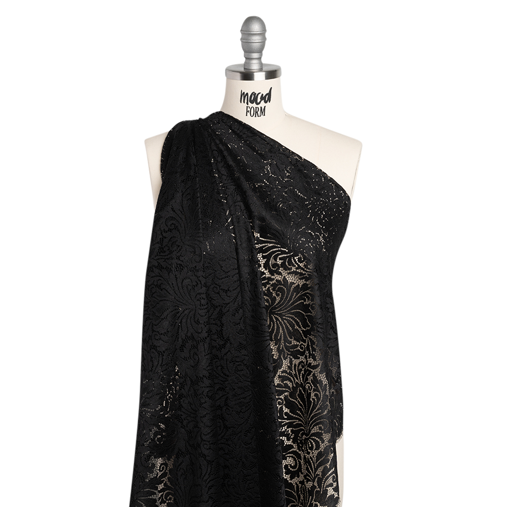 Read Poe’s poetry beneath candlelight in this Black Ornamental Floral Raschel Lace Panel with Scalloped Finished Edges—featuring a soft hand and fluid, airy drape.Suggested Projects: Shirts, Skirts, Dresses, LingerieContent: 85% Nylon, 15% RayonStretch: NoneOpacity: SheerOrnamental flowers loop and bloom across this black raschel lace panel. A fluid, airy drape and soft, slightly tactile hand makes it ideal for loose, flowy silhouettes—with a scalloped finished edge making completing your projects that much easier. With its delicate design, we envision waterfall skirts, breezy button-up shirts, romantic robes, lingerie, and more! Sheer, use it as a panel or insert a lining for more opacity. Please note: This is a panel measuring 41” by 60”.