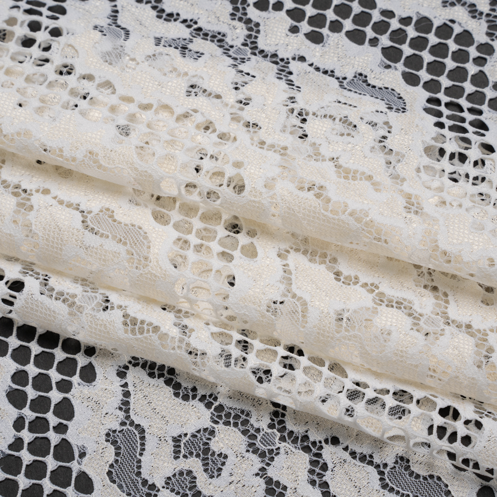 Breeze into softness with this Ivory Abstract Wavy Stripes Raschel Lace with Organic Finished Edges, where airy texture and graceful lines come together in perfect harmony.Suggested Projects: Dresses, Skirts, Blouses, LingerieContent: 76% Nylon, 24% PolyesterStretch: NoneOpacity: SheerFlowing, irregular stripes ripple across a raschel lace base, adding energy and dimension to any design. The sinuous pattern is mirrored by organically finished edges that follow the fabric’s natural motion—perfect for hems and overlays that need no extra trimming. With its featherlight hand and textural intrigue, this lace brings artistry to ornate blouses, slip dresses, ruffled skirts, or lingerie-inspired looks. Add a lining to enhance opacity while letting the bold pattern shine through.
