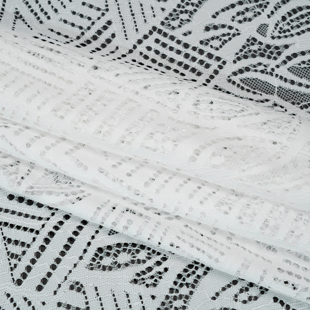Every angle of this Ivory Geometry and Leaves Raschel Lace with Organic Finished Edges is a good one—featuring a soft hand and fluid drape.Suggested Projects: Shirts, Skirts, Dresses, LingerieContent: 100% NylonStretch: Warpwise Mechanical GiveOpacity: SheerGeometric forms and leaves weave their way across this ivory raschel lace, leading you towards new design horizons. A fluid drape and soft hand makes it ideal for airy silhouettes and flowing evening wear—with an organic finished edge making completing your projects that much easier. With its winding design, we envision waterfall skirts, breezy button-up shirts, overlays for flowing evening gowns and structured jackets, lingerie, and more! Sheer, due to the lace weave, use it as a panel or insert a lining for more opacity.Please Note: This is a panel that measures about 52/54” by 50”.