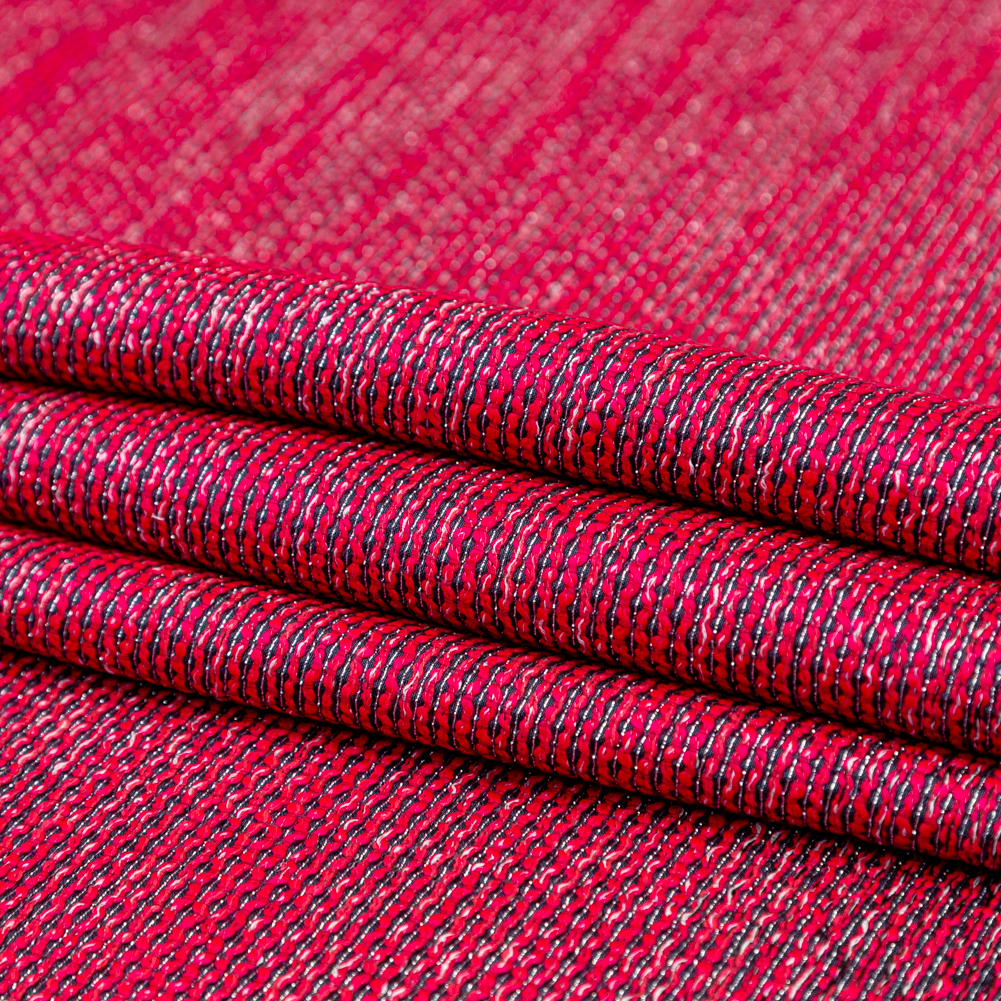 No one will be able to dull your sparkle when you're rocking this Raspberry Sorbet, Black and Metallic Silver Striped Woven! Featuring a heavily condensed area of vibrant color gradually becoming sparse along a black backdrop, this woven provides a visual similar to that of an ombre. A soft, textured hand paired with a light, yet modestly structured drape makes for a fantastic medium when it comes to statement-making blazers, intriguing jackets with an ombre effect, stand-out bottoms and more! A mostly opaque construction deems a lining unnecessary unless additional structure or insulation are desired.