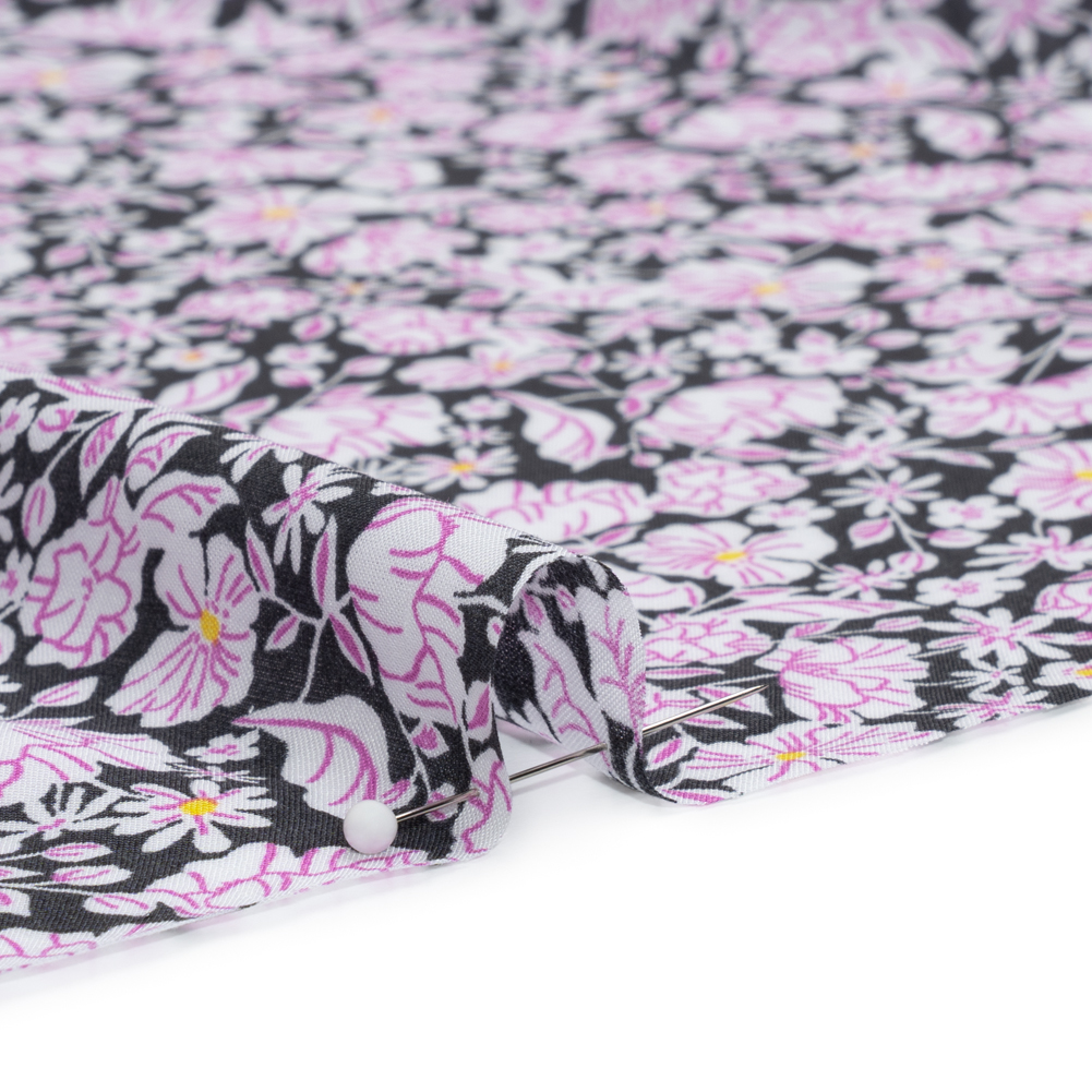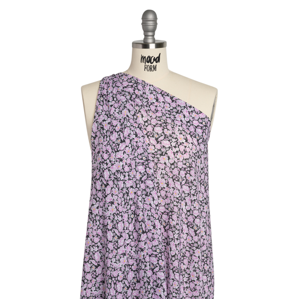 Bring a carefree summer feeling with you wherever you go in this Charcoal, White and Pink Floral Rayon Batiste, featuring a lightweight, airy drape and slight translucence.Suggested Projects: Dresses, Shirts, Pants, SkirtsContent: 100% RayonStretch: No StretchOpacity: Semi-TransparentBatiste is a plain-weave fabric that has solidified its place in wardrobes since the Middle Ages. Changing from linen to cotton to now synthetic, the content of batiste has evolved yet its connection to elegance hasn’t wavered. With a lightweight, airy drape and smooth hand, use this fabric to create maxi bias-cut skirts, billowing sundresses, brilliantly-patterned camp shirts, and breezy wide-leg trousers. Slightly transparent, a lining may be desired for increased opacity depending on application.