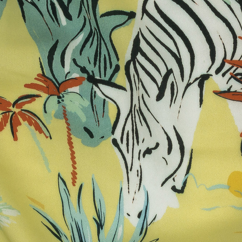 Wear the vibrant beauty of the jungle with our Mood Exclusive Mellow Yellow Birds of Play Rayon Batiste. This stunningly unique print features hand-painted animals roaming a bright, lemon peel yellow jungle under the bright sun—zebras, toucans, frogs, and more explore in rich shades of tiger orange, dusty teal, midnight navy, and white. Lightweight, breathable, and with a subtle sheen, this batiste combines the simplicity of a fine, plain weave with the silkiness of rayon to produce a material that's incredibly lux. With a smooth, soft hand and a billowing, fluid drape, create fluttering circle skirts, summer maxi dresses, youthful blouses with flutter sleeves, and comfortable shorts—don't forget to consider palazzo pants! A lining won't be necessary for opacity but may be useful for adding structure to some garments.