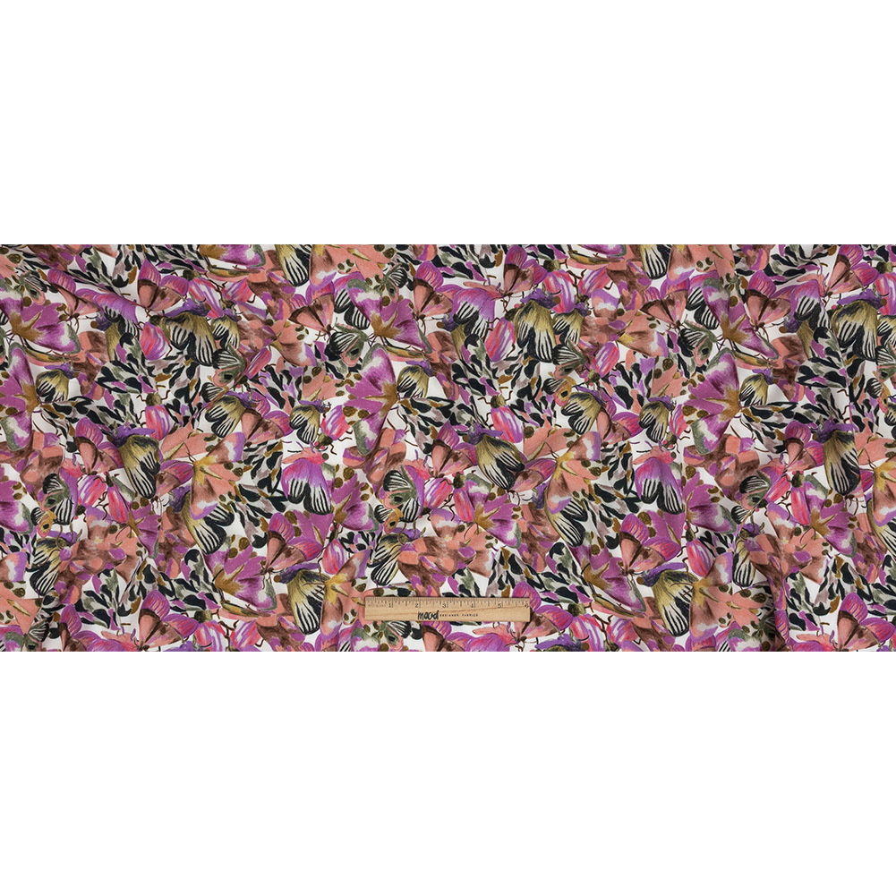 From the French word “papillon” meaning butterfly, meet our stunningly intricate Mood Exclusive Pink and White Pastel Papillon Rayon Batiste. This strikingly unique print features hand-drawn butterflies in thick pastel-like strokes of lilac purple, dusty coral pink, and greenish-brown with black accents fluttering over a white background. Lightweight, breathable, and with a subtle sheen, this batiste combines the simplicity of a fine, plain weave with the silkiness of rayon to produce a material that's incredibly lux. With a smooth, soft hand and a billowing, fluid drape, create fluttering circle skirts, summer maxi dresses, youthful blouses with flutter sleeves, and comfortable shorts—don't forget to consider palazzo pants! Mostly opaque, a lining won't be necessary for opacity but may be useful for adding structure to some garments.