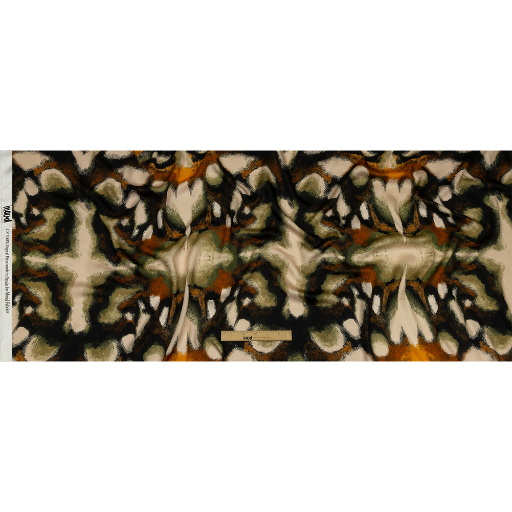 A dappled pattern of deep shadows and golden sunlight appears through the thinning leaves, casting abstractions that almost seem to be alive. Our Mood Exclusive From the Earth Rayon Challis seems to emerge from the ground in a kaleidoscopic pattern of black, orange, rust, and olive on a cream ground. A cozy addition to The Rockland Collection, this Challis is fluid and billowy in drape, with a soft, smooth feel. Boasting a subtle sheen and undeniably rich colors, craft sweet tank tops, breezy trapeze dresses, or effortless blouses. Slightly translucent, a lining may be desired for increased opacity depending on its application. Swing by our Mood Sewciety Blog to take a glance at over 300 free sewing patterns for more inspiration. For rayon Challis, we recommend the Clay Shirt, Nyssa Dress, and Calendula Blouse.MoodEarth Verified: This fabric is composed of viscose fibers derived from suppliers ranked as Green Shirt by Canopy, earned with attention to sustainable wood and pulp sourcing, backed by efforts to conserve critical forests. For more information on Mood's sustainability initiatives, check out MoodEarth here.