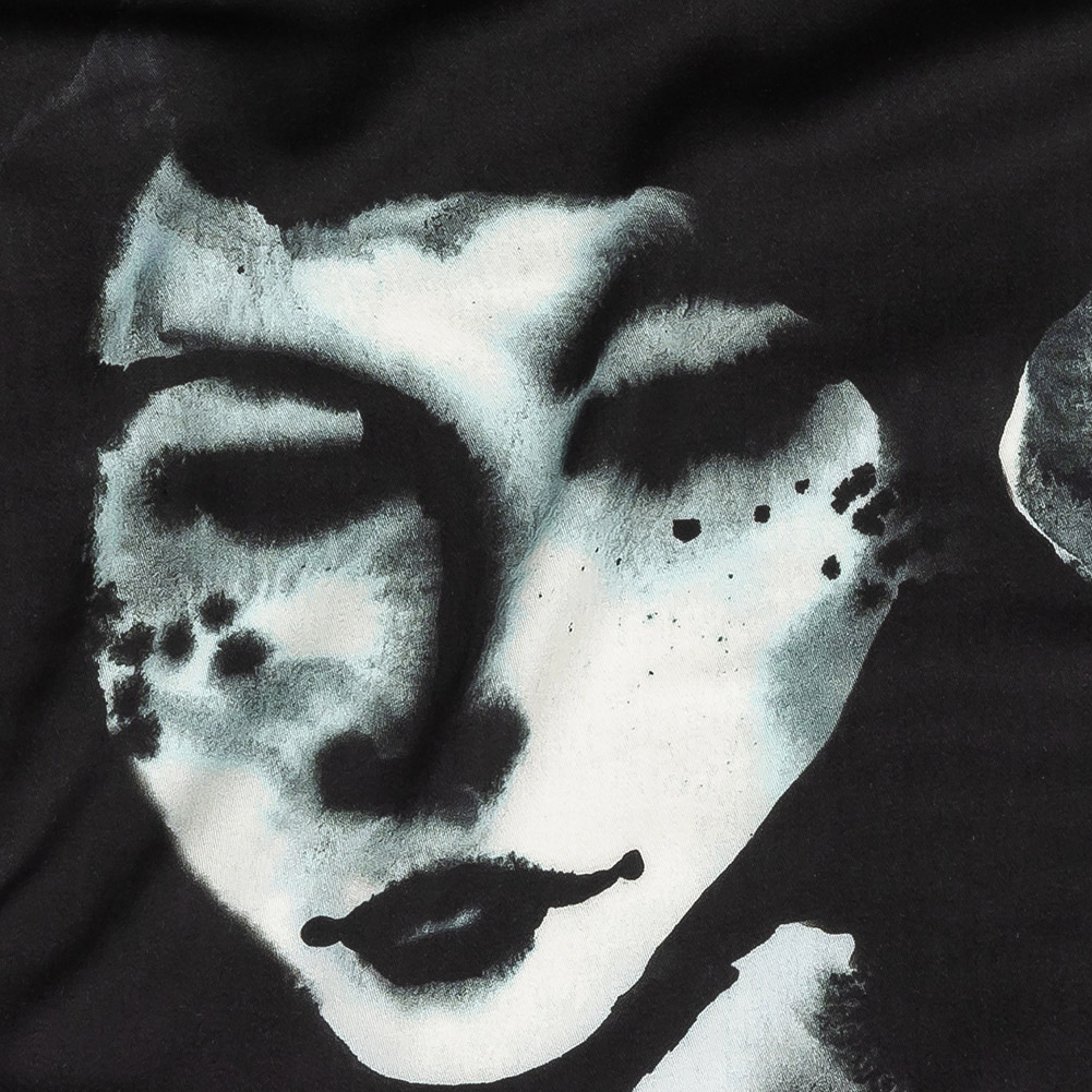 Pale faces appear in the darkness on our Mood Exclusive Unearthly Portrait Rayon Challis, with shadowed eyes that seem to follow you as you move, framed by wild dark hair.