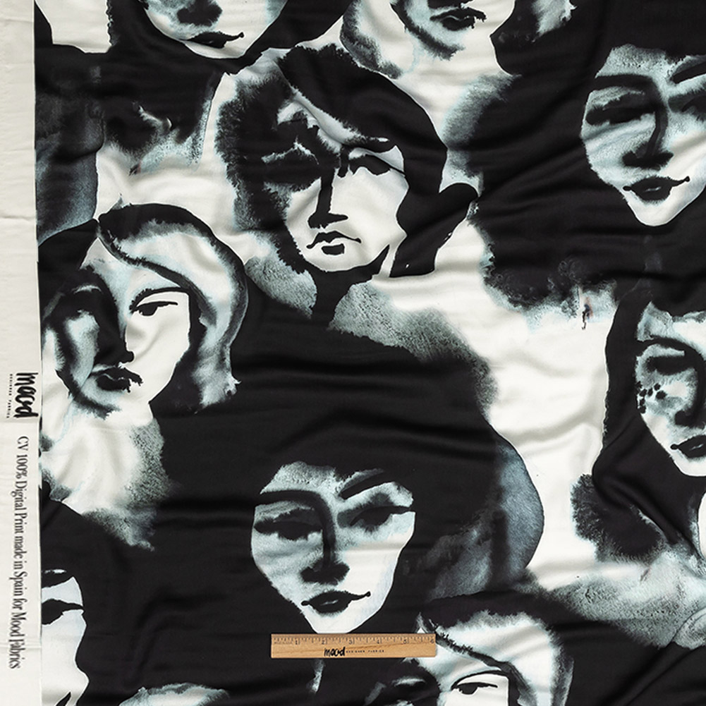 Pale faces appear in the darkness on our Mood Exclusive Unearthly Portrait Rayon Challis, with shadowed eyes that seem to follow you as you move, framed by wild dark hair. A painterly pattern captivates and disturbs in equal measure. Part of The Twilight Collection, this deceptively simple woven fabric boasts a chilling printed pattern. Use its billowy, fluid drape to fashion an assortment of warm weather garments, such as flowing rah-rah skirts, sundresses, and midriff blouses. Slighty translucent, a lining may be desired for increased opacity depending on its application. Swing by our Mood Sewciety Blog to take a glance at our free Aspen Ensemble, Rue Dress and Onella Blouse sewing patterns for more inspiration.MoodEarth Verified: This fabric is composed of viscose fibers derived from suppliers ranked as Green Shirt by Canopy, earned with attention to sustainable wood and pulp sourcing, backed by efforts to conserve critical forests. For more information on Mood's sustainability initiatives, check out MoodEarth here.