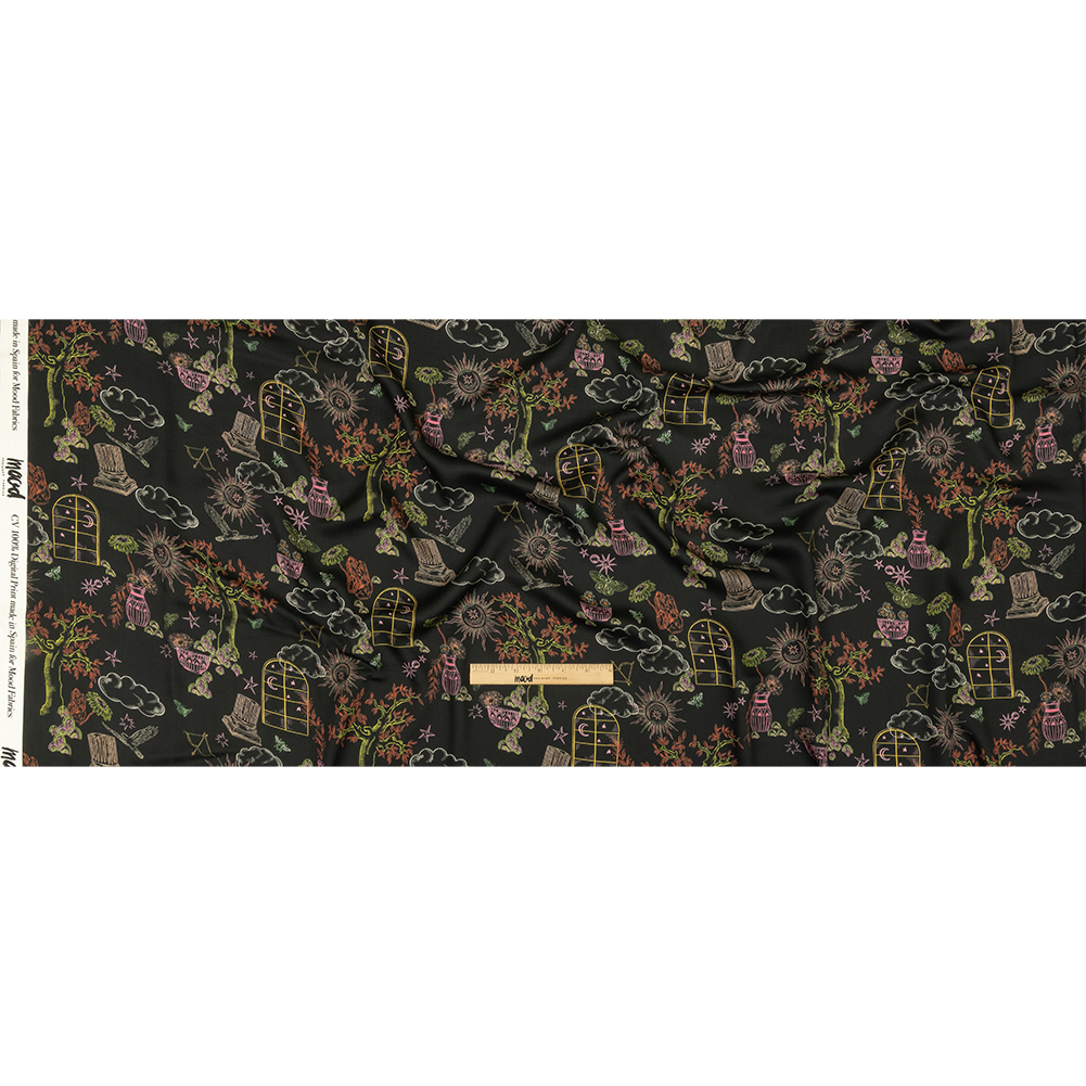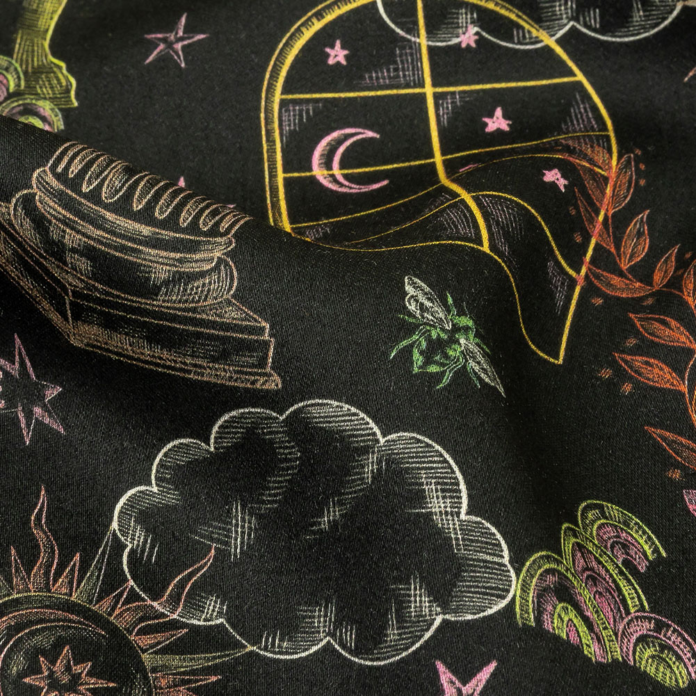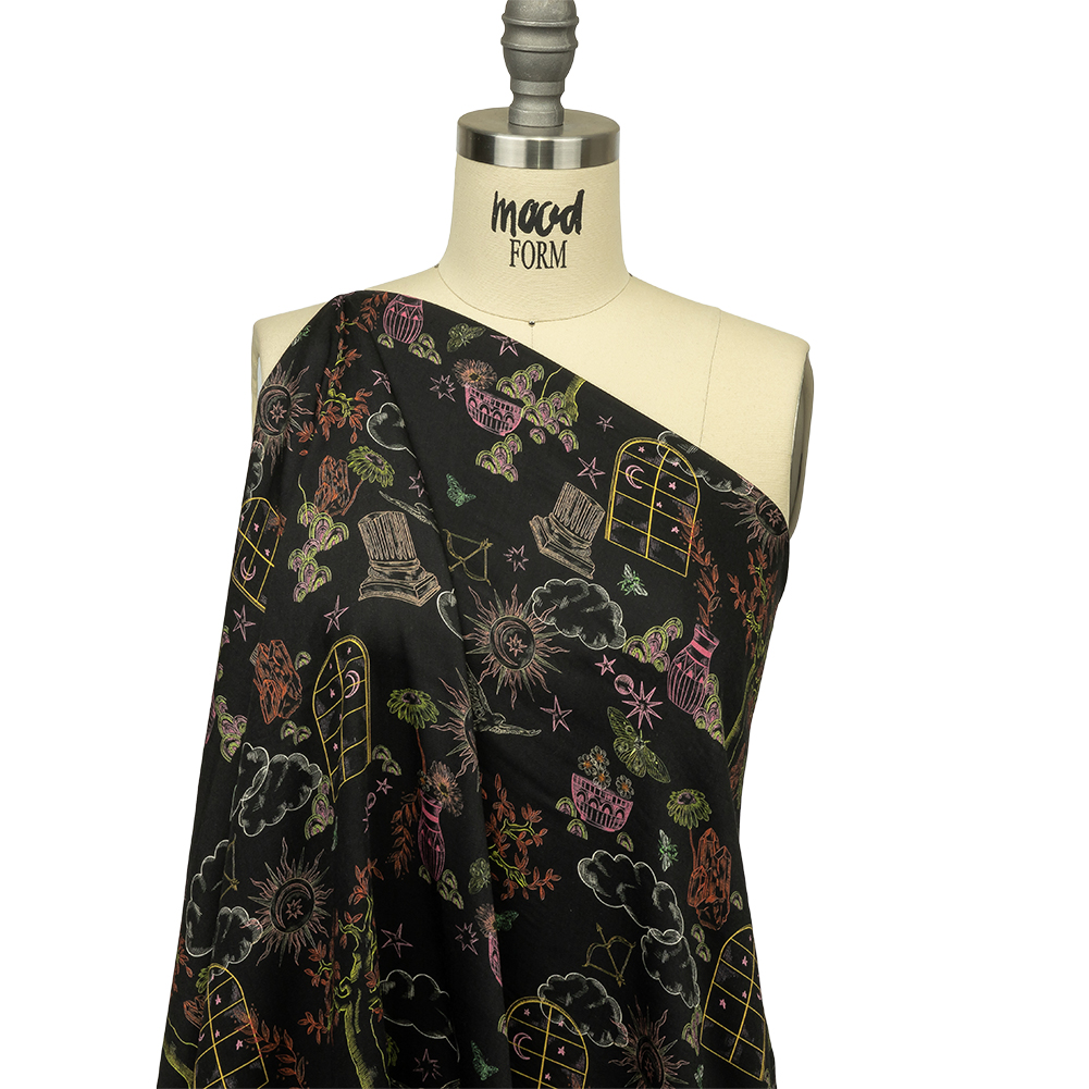 Artfully etched in an array of bright shades against a midnight backdrop, our Summer Nights Rayon Challis offers a lightweight, finely woven fabric known for its softness, smooth texture, and excellent drape.Suggested Projects: Dresses, BlousesContent: 100&#37 ViscoseStretch: NoneOpacity: Semi TranslucentAn open window invites a warm summer breeze, accompanied by the gentle chirping of crickets and the soft glow of starlight illuminating everything in sight. This design features trees, plants, clouds, and small creatures in addition to windows looking on the night sky, broken columns, bows and arrows, and a smattering of stars, altogether creating an enchanting assemblage. Part of The Citrus Collection, this Challis is fluid and billowy in drape, with a soft, smooth feel. Boasting a subtle sheen and undeniably rich colors, craft sweet tank tops, breezy trapeze dresses, or effortless blouses. Slightly translucent, a lining may be desired for increased opacity depending on its application.