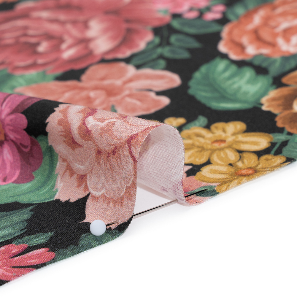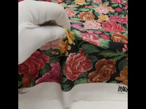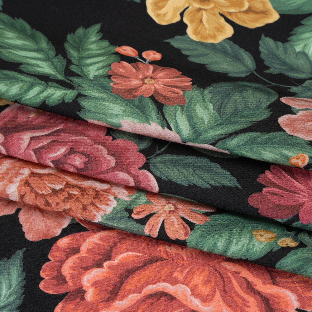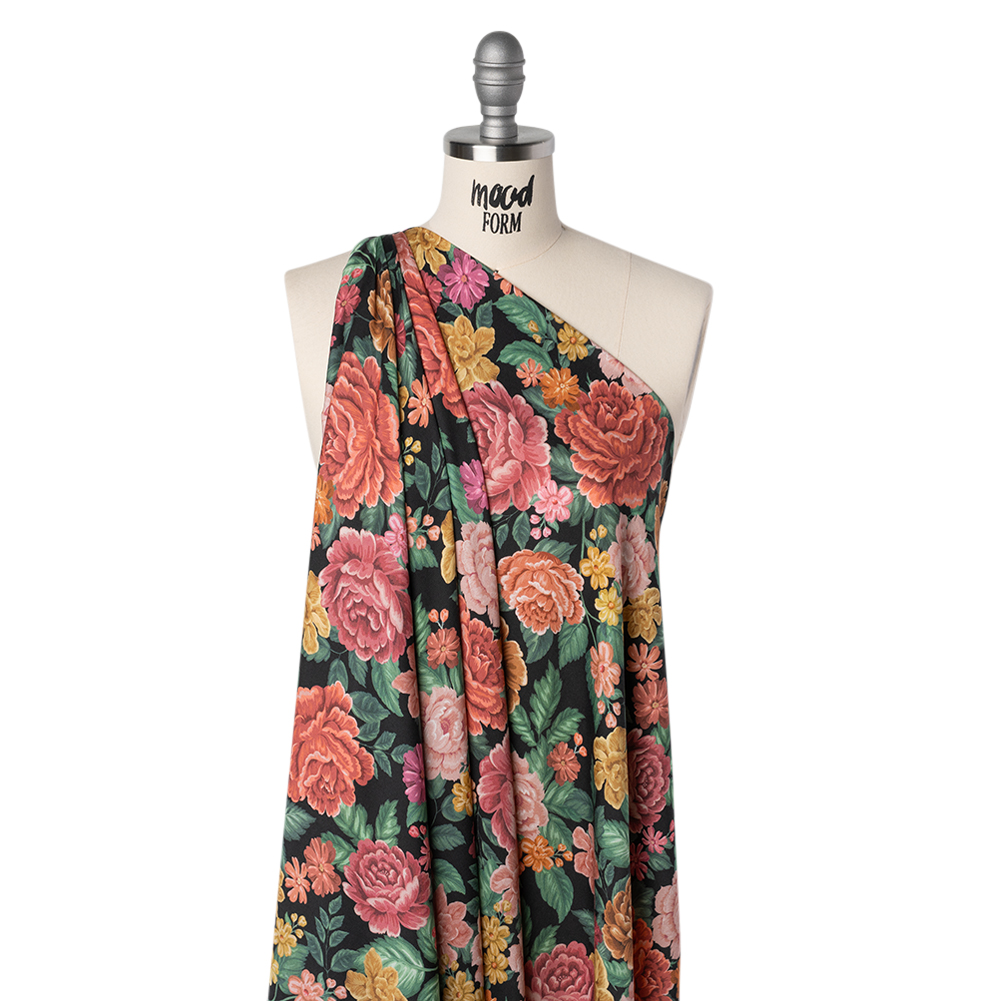 Take a stroll through style with our Mood Exclusive Midnight Garden Rayon Challis—a dreamy floral for after-dark elegance.Suggested Projects: Shirts, Jackets, Pants, Skirts Content: 100&#37 Viscose Stretch: NoneOpacity: Slightly Translucent Different varieties of peonies and other lush blooms open across a black background, surrounded by leafy green accents that add a fresh, natural depth. With its smooth surface, cool hand, and fluid drape, this 100&#37 viscose challis is well-suited for soft shirts, unlined jackets, flowing pants, and swishy skirts. The mostly opaque weave makes it easy to style without lining, while still keeping the look light and breathable. Ideal for day-to-night designs, this fabric offers comfort, movement, and dramatic charm all in one.