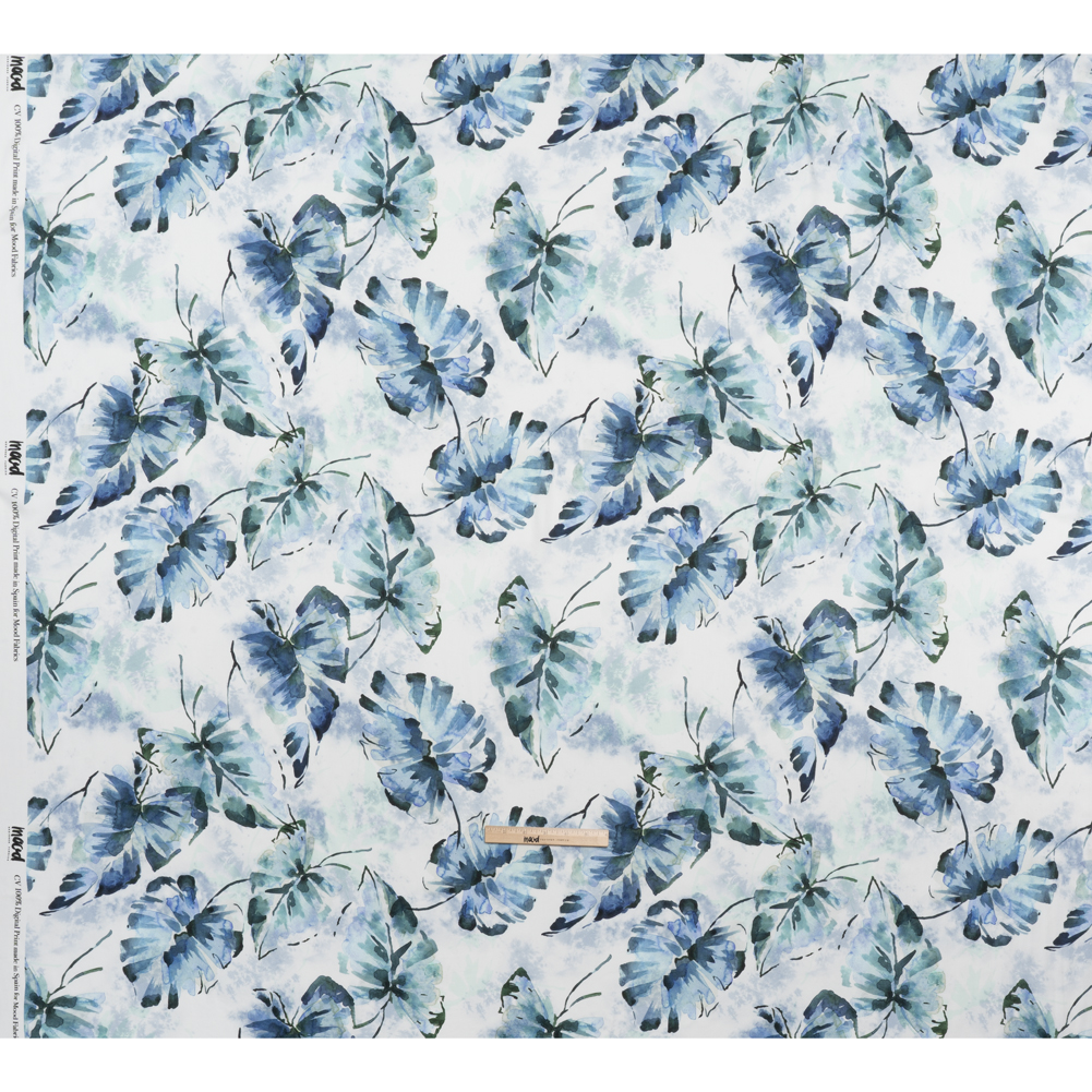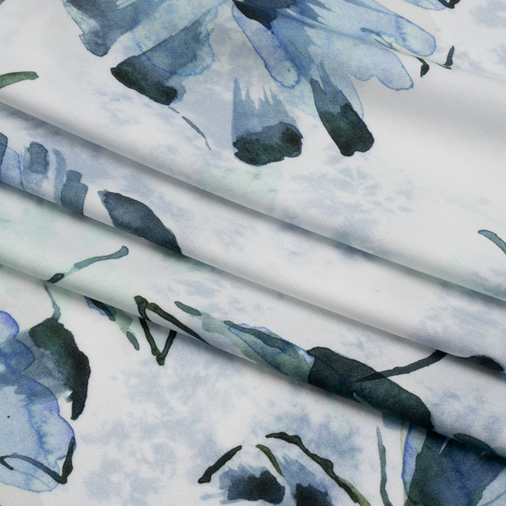 Our Mood Exclusive Whispering Waterfall Rayon Challis invites you to take time to unwind—featuring a lightweight, airy drape and translucence under the spring and summer sun.Suggested Projects: Dresses, Skirts, Tops, PantsContent: 100% ViscoseStretch: NoneOpacity: TranslucentFollow the soothing trickle of a stream as it winds through lush, verdant landscapes, leaves drifting along its surface, carried by the gentle current. This watercolor-inspired design, set against a bright white backdrop, features dark blue and hunter green leaves, their delicate forms floating amidst abstract clouds of pale blue. With a lightweight, airy drape and a smooth hand, this rayon challis is perfect for creating breezy wrap dresses, wide-legged pants that waterfall down your legs, or earth-toned button-ups for all your spring garment needs. Translucent, a lining may be desired for increased opacity depending on its application.