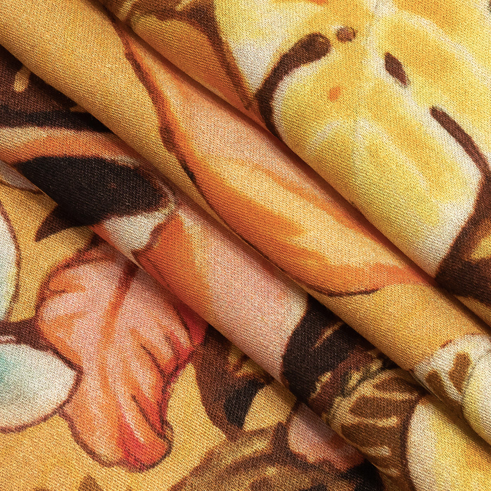 The fiery warmth of Mediterranean sunlight spreads over lush blooms, succulent leaves, and vibrant birds including flamingos. Our Mood Exclusive Toscana Rayon Challis draws dreamily from the excitement and peace of the Italian countryside. Part of The Viso Collection, this deceptively simple woven fabric boasts a brilliant printed pattern. Soft and smooth in hand, its lightweight and anti-static surface offers incredible breathability. Use its billowy, fluid drape to fashion an assortment of warm weather garments, such as flowing rah-rah skirts, sundresses, and midriff blouses. Slighty translucent, a lining may be desired for increased opacity depending on its application. Swing by our Mood Sewciety Blog to take a glance at our free Aspen Ensemble, Rue Dress and Onella Blouse sewing patterns for more inspiration.MoodEarth Verified: This fabric is composed of viscose fibers derived from suppliers ranked as Green Shirt by Canopy, earned with attention to sustainable wood and pulp sourcing, backed by efforts to conserve critical forests. For more information on Mood's sustainability initiatives, check out MoodEarth here.
