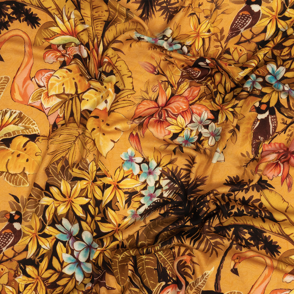 Rayon Challis - Gold and Pink Flamingoes and Flowers - Toscana Print - Mood Exclusive Viso Collection