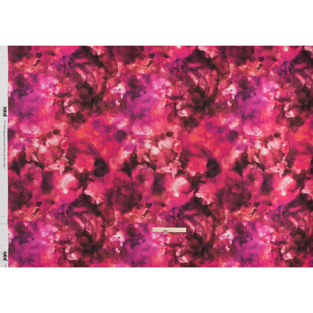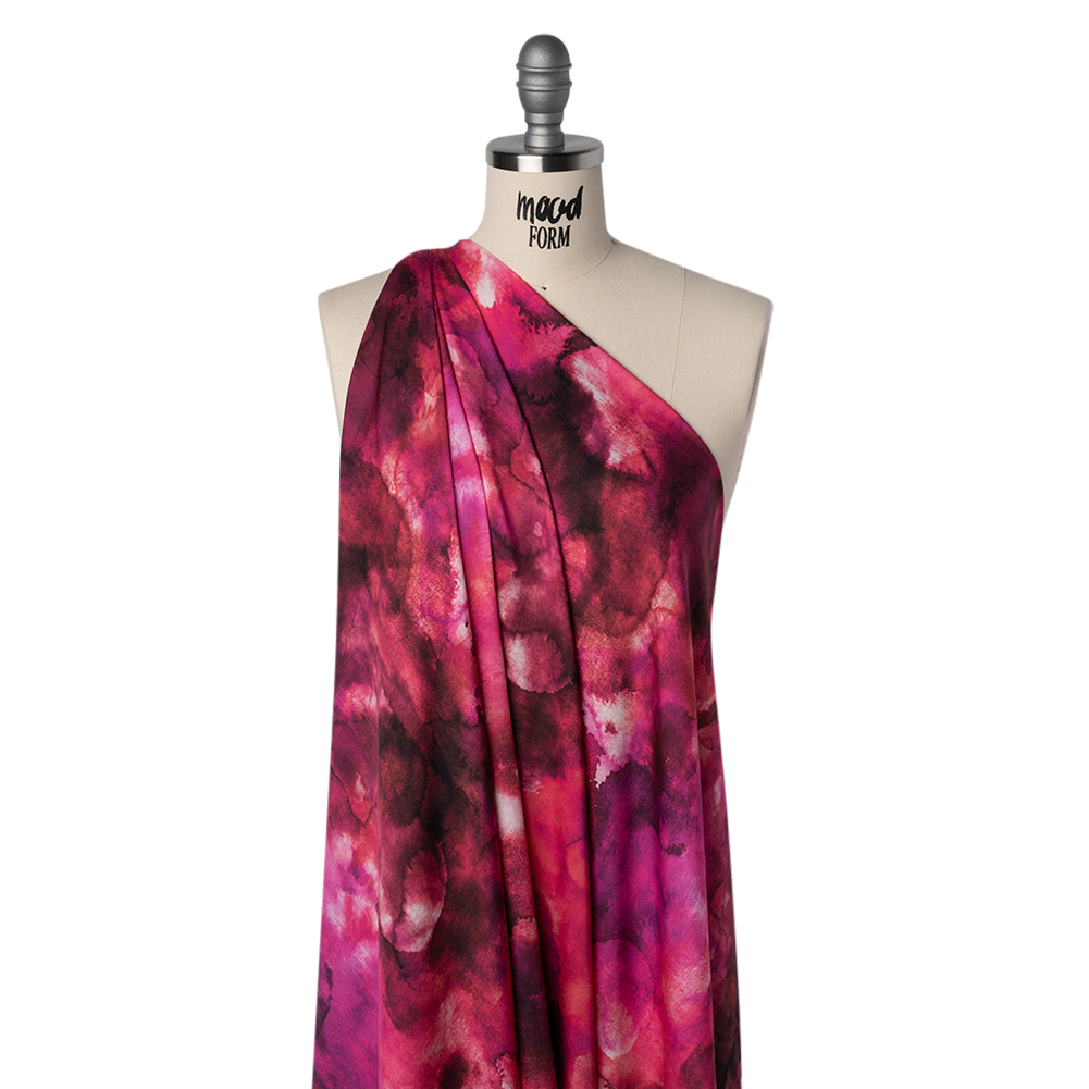 Turn up the saturation with our Mood Exclusive Pigment Pulse Rayon Challis—where every bold hue pops with expressive flair, ideal for statement pieces that sway with movement.Suggested Projects: Shirts, Jackets, Pants, Skirts Content: 100&#37 Viscose Stretch: NoneOpacity: Slightly Translucent Featuring abstract watercolor tie-dye in hot pink, purple, and charcoal that shifts like painted waves across the surface, this 100&#37 viscose challis offers a smooth hand and light, breathable weight. Its fluid drape moves beautifully with the body, making it ideal for designs that benefit from motion and softness. Slightly translucent, the fabric delivers airy coverage that’s well-suited to warm-weather layering. Easily transform it into camp shirts, floaty overshirts, wide-leg trousers, or tiered midi skirts. For styles requiring more structure or modesty, a lining is recommended.