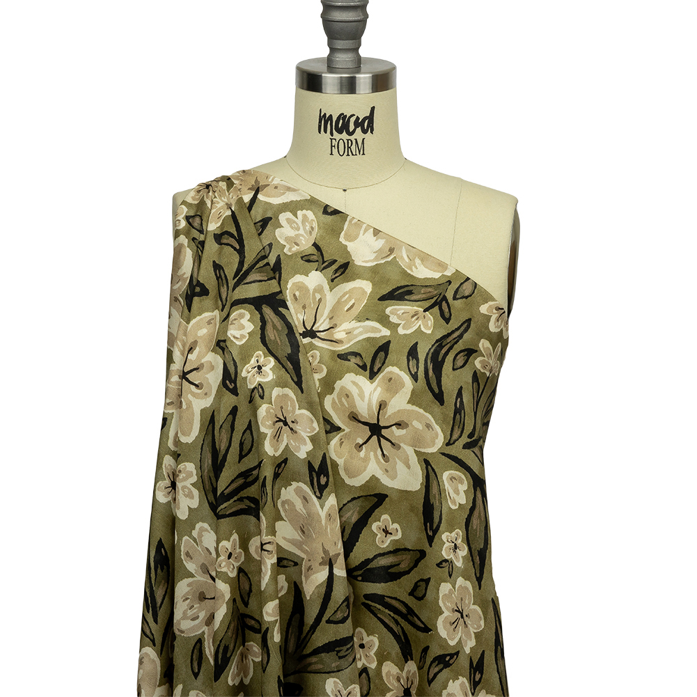 Growth and life are not yet ready to give way to winter's quiet. You'll find bright flowers still dancing in fall's golden sun on our Mood Exclusive Green Wildflower Walk Rayon Challis! A cozy addition to The Rockland Collection, this Challis is fluid and billowy in drape, with a soft, smooth feel. Boasting a subtle sheen and undeniably rich colors, craft sweet tank tops, breezy trapeze dresses, or effortless blouses. Slightly translucent, a lining may be desired for increased opacity depending on its application. Swing by our Mood Sewciety Blog to take a glance at over 300 free sewing patterns for more inspiration. For rayon Challis, we recommend the Clay Shirt, Nyssa Dress, and Calendula Blouse.MoodEarth Verified: This fabric is composed of viscose fibers derived from suppliers ranked as Green Shirt by Canopy, earned with attention to sustainable wood and pulp sourcing, backed by efforts to conserve critical forests. For more information on Mood's sustainability initiatives, check out MoodEarth here.