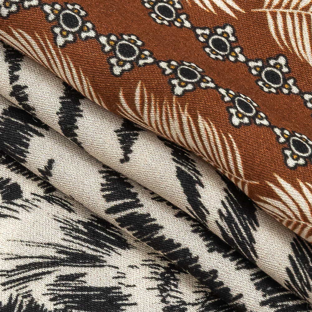The largest of the big cats has come to play. Despite a gentle demeanor, caution is of the utmost importance, for the tiger is not a creature to be trifled with. Our Mood Exclusive Smiling Peril Rayon Challis shows off the charisma of a tiger in a square bordered by palm leaves, but don't be fooled: he isn't contained at all! A fantastic part of The Rio Collection, this simple woven fabric is sumptuous against the skin. Soft and smooth in hand, its lightweight and anti-static surface offers incredible breathability. Use its billowy, fluid drape to fashion an assortment of warm weather garments, such as flowing rah-rah skirts, sundresses, and midriff blouses. Slighty translucent, a lining may be desired for increased opacity depending on its application. Swing by our Mood Sewciety Blog to take a glance at our free Aspen Ensemble, Rue Dress and Onella Blouse sewing patterns for more inspiration. Note that this panel consists of two bordered squares.MoodEarth Verified: This fabric is composed of viscose fibers derived from suppliers ranked as Green Shirt by Canopy, earned with attention to sustainable wood and pulp sourcing, backed by efforts to conserve critical forests. For more information on Mood's sustainability initiatives, check out MoodEarth here.