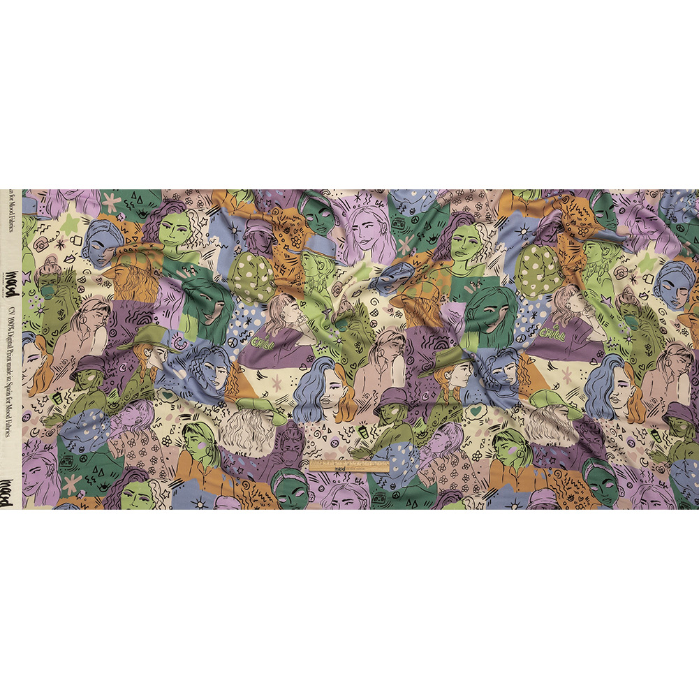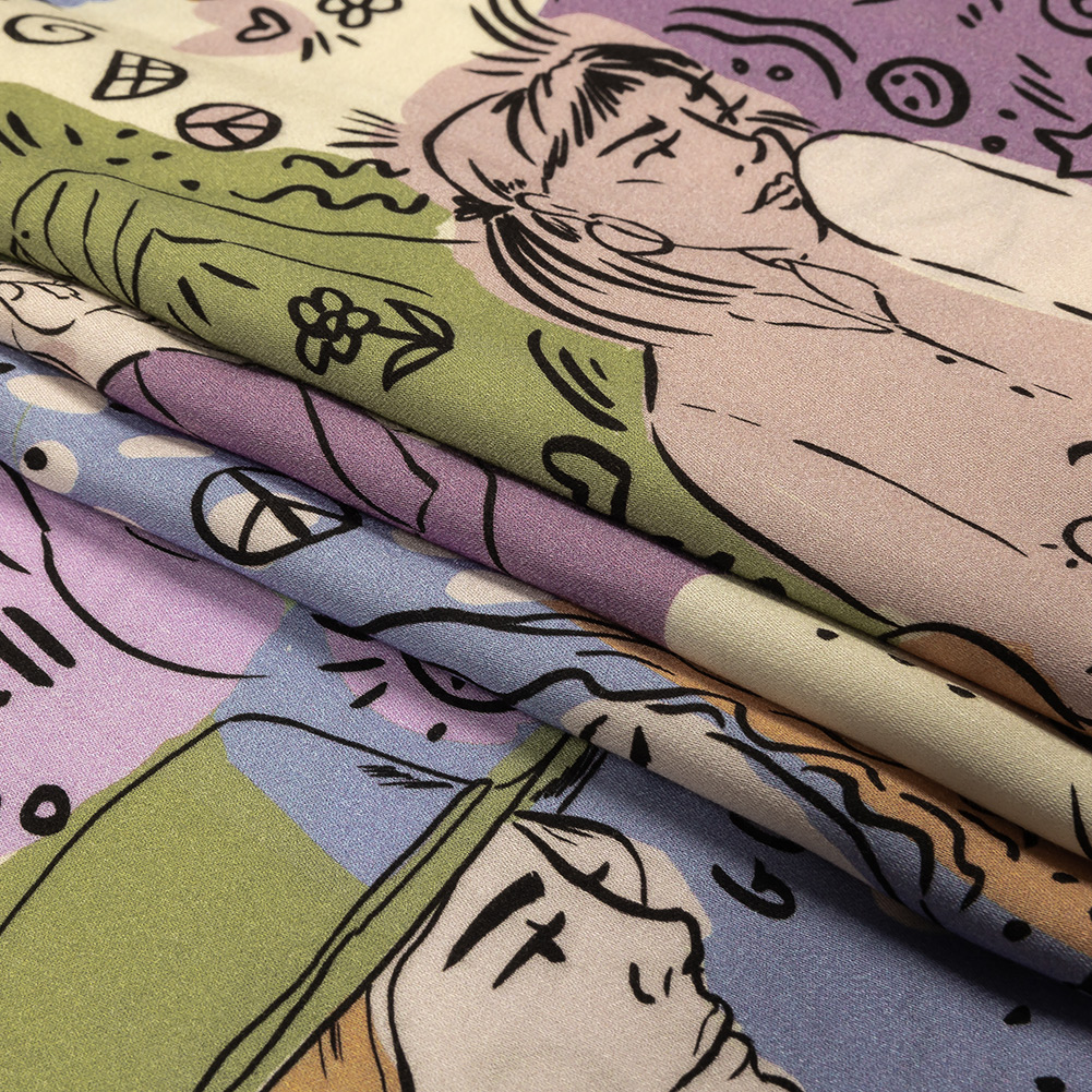 Rayon Challis - Purple and Green Figures and Doodles - Serene Souls Print - Mood Exclusive Wisteria Collection