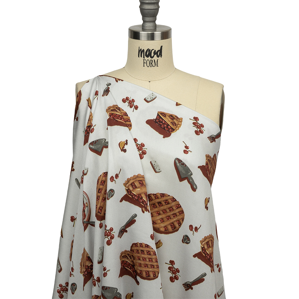 There's nothing like coming home to the smell of a fresh-baked cherry pie, with familiar faces in the kitchen lending even more warmth with their smiles. Our Mood Exclusive Baked Fresh Rayon Challis provides a playful pattern of pie slices and cutlery, ready for you to enjoy! A cozy addition to The Rockland Collection, this Challis is fluid and billowy in drape, with a soft, smooth feel. Boasting a subtle sheen and undeniably rich colors, craft sweet tank tops, breezy trapeze dresses, or effortless blouses. Slightly translucent, a lining may be desired for increased opacity depending on its application. Swing by our Mood Sewciety Blog to take a glance at over 300 free sewing patterns for more inspiration. For rayon Challis, we recommend the Clay Shirt, Nyssa Dress, and Calendula Blouse.MoodEarth Verified: This fabric is composed of viscose fibers derived from suppliers ranked as Green Shirt by Canopy, earned with attention to sustainable wood and pulp sourcing, backed by efforts to conserve critical forests. For more information on Mood's sustainability initiatives, check out MoodEarth here.