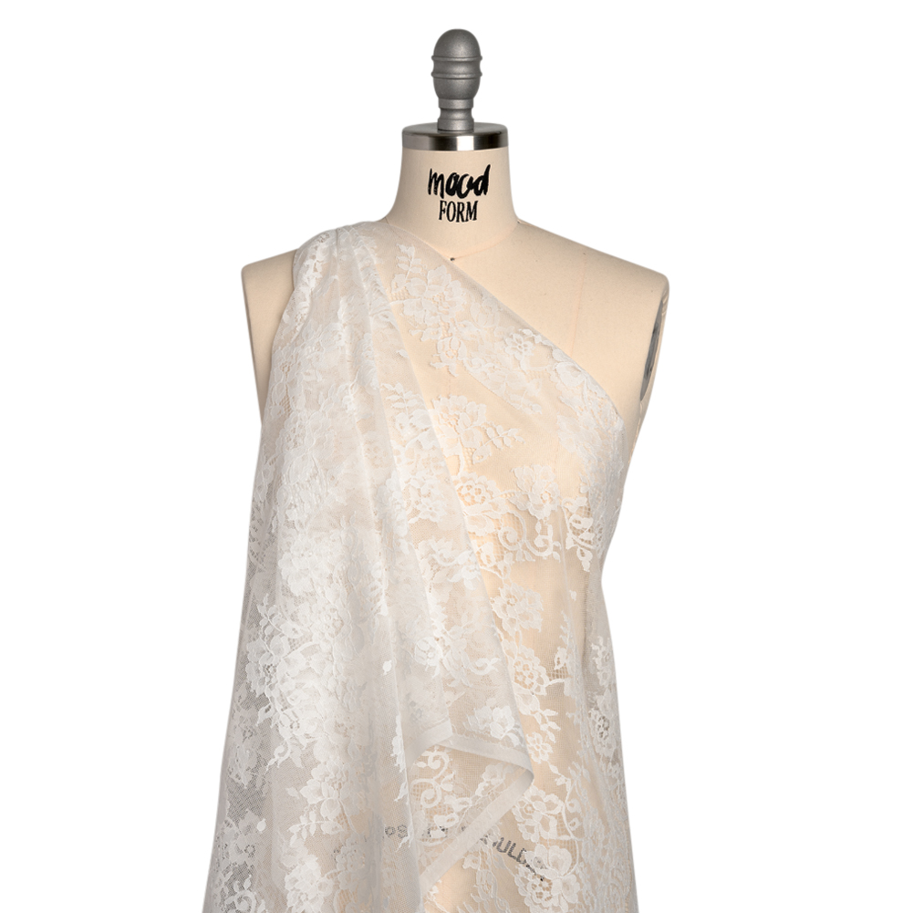 You’ve been dreaming of this Flowers and Leaves Re-Embroidered Lace, with its surprisingly bold floral pattern, crisp and softly textured feel, and light, airy drape.Suggested Projects: Bridal Wear, Gowns, Dresses, Blouses, LingerieContent: 100% NylonStretch: Slight Mechanical GiveOpacity: SheerBig opaque flowers sit in a sheer, net-like ground, outlined with thicker threads. At the edges, a scalloped pattern forms, which functions as a finished edge when the selvages are trimmed away. The lightweight drape, sheer nature, and crisp hand make this lace perfect for everything from bridal gowns to lingerie to summer dresses and coverups. As this fabric is entirely sheer, a lining or solid fabric may be necessary for opacity, depending on your project.Please Note: This lace is produced in three-yard increments. Any orders for more than three yards will be filled in multiple cuts.