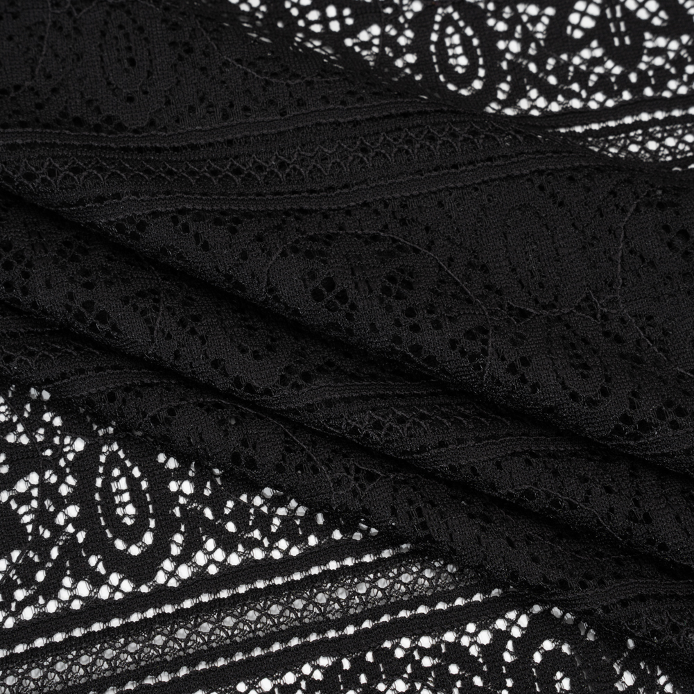 Shadows and sophistication rise from this Black Floral Medallion Stripes Re-Embroidered Lace with Finished Edges—featuring a soft hand and fluid, flexible drape.Suggested Projects: Shirts, Skirts, Dresses, LingerieContent: 100% NylonStretch: Warpwise Mechanical GiveOpacity: SheerMedallion stripes stretch across this black re-embroidered lace, each filled with blooming flowers, leaves, and vines. A soft hand and fluid, flexible drape make it a dream for airy silhouettes and flowing eveningwear—with a fringed, finished edge making it easy to work with and effortlessly elegant. With its whimsical, garden-inspired motifs, envision it transformed into waterfall skirts, breezy blouses, bell-bottom pants, romantic lingerie, and more! Sheer by nature, a lining may be desired for added coverage and structure.Please Note: This is a panel that measures about 50/52” by 50”.