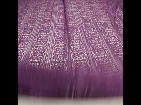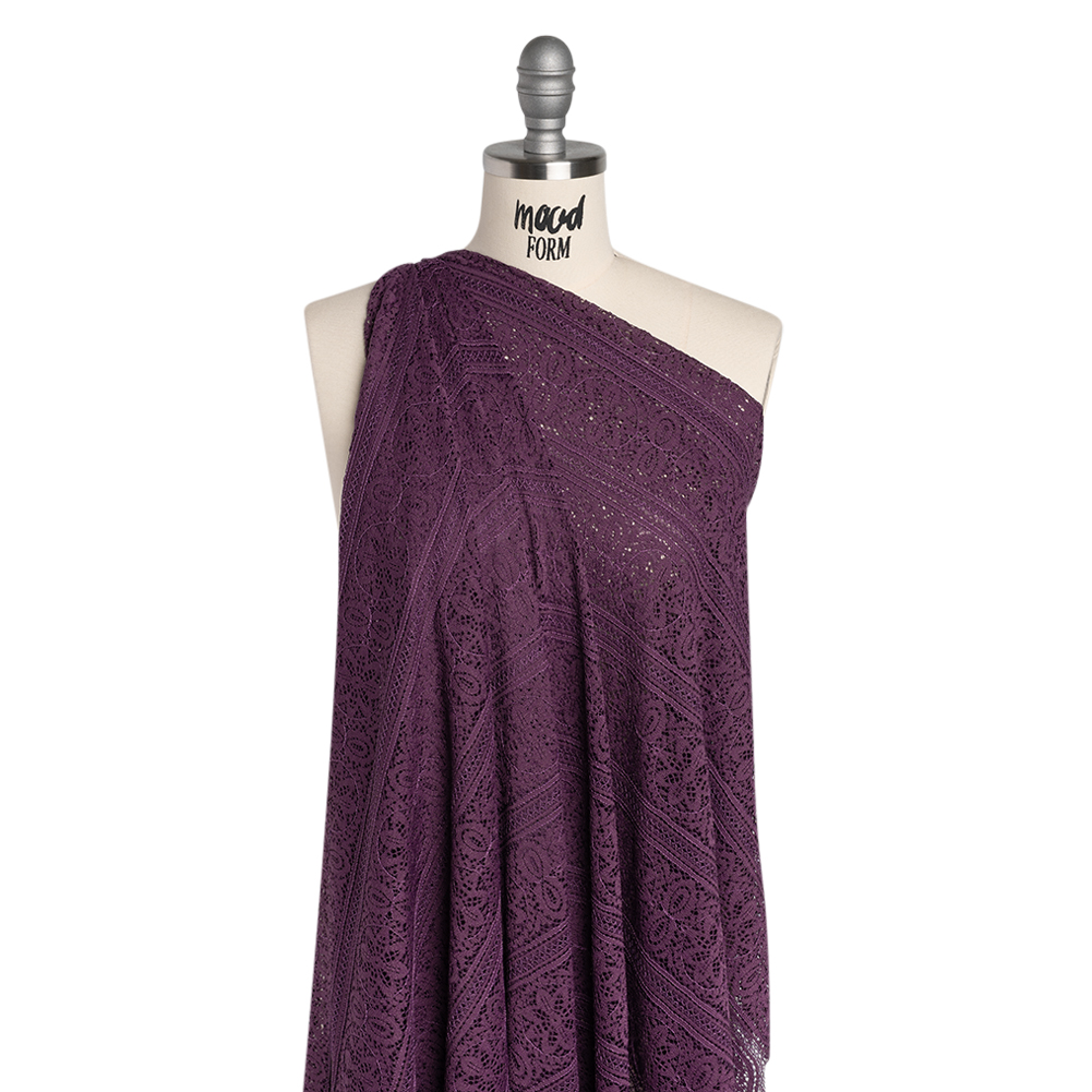Divine your next design from the leaves atop this Shadow and Purple Floral Medallion Stripes Re-Embroidered Lace with Finished Edges—featuring a soft hand and fluid, flexible drape.Suggested Projects: Shirts, Skirts, Dresses, LingerieContent: 100% NylonStretch: Warpwise Mechanical GiveOpacity: SheerMedallion stripes stretch across this shadowy purple re-embroidered lace, each filled with blooming flowers, leaves, and vines. A soft hand and fluid, flexible drape make it a dream for airy silhouettes and flowing eveningwear—with a fringed, finished edge making it easy to work with and effortlessly elegant. With its whimsical, garden-inspired motifs, envision it transformed into waterfall skirts, breezy blouses, bell-bottom pants, romantic lingerie, and more! Sheer by nature, a lining may be desired for added coverage and structure.Please Note: This is a panel that measures about 50/52” by 50”.