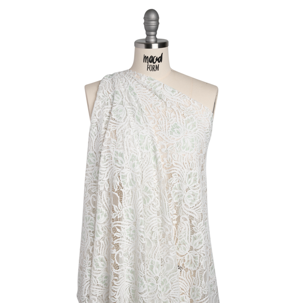 Refresh your wardrobe with this Ivory and Dusty Aqua Blossom Trios and Leaves Re-Embroidered Stretch Lace with Finished Edges—featuring a soft hand and fluid, flexible drape.Suggested Projects: Shirts, Dresses, Skirts, PantsContent: 75% Nylon, 15% Rayon, 10% SpandexStretch: 50% WarpwiseOpacity: SheerThis soft, tactile lace showcases clusters of blossoms blooming amid delicate leaves in an ivory hue woven through with dusty aqua. A moderate stretch through the warp and fluid, flexible drape makes it ideal for both bodycon and flowing silhouettes—with a finished edge making completing your projects that much easier. With its delicate design, we envision bodycon dresses, waterfall skirts, bodysuits, bell-bottom pants, and more! Sheer, use it as a panel or insert a lining for more opacity.