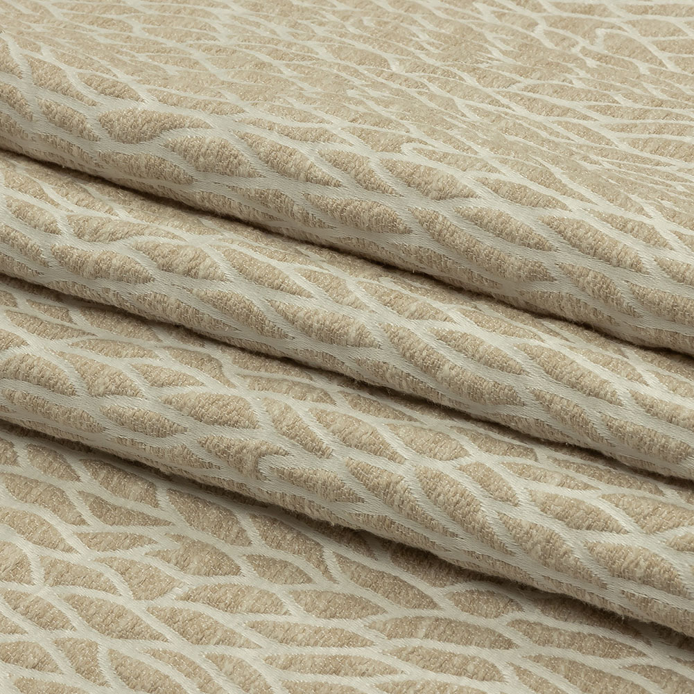 A vanilla cream ocean made up of shimmering little waves lands on this British Imported Champagne Stepping Stones Recycled Polyester Drapery Jacquard.