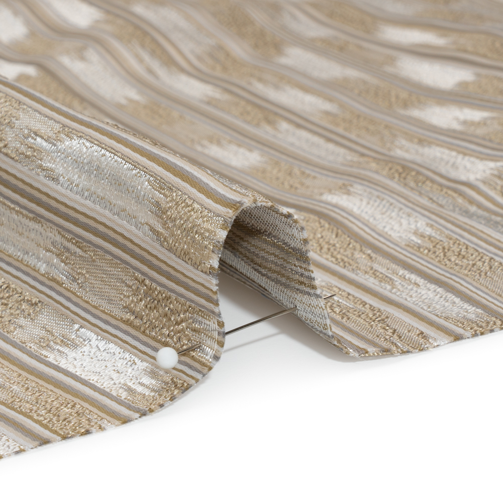 Made with recycled polyester, this Flax Streaking Stripes Drapery Jacquard features a dimensional face, supple drape, and sleek hand that’s perfect for all your window treatment needs!Suggested Projects: Bed Canopies, Curtains, Valances, DrapesContent: 72% Recycled Polyester, 28% PolyesterStretch: NoneOpacity: Mostly OpaqueCreate a palace out of this champagne and beige Jacquard! Rippled beige streaks rise from a champagne-colored background as striped ribbons line the foreground. Woven on a specific loom, Jacquards yield a sophisticated texture that resembles embroidery—and always evokes elegance. A metallic luster is the final touch of luxury, solidifying this fabric's place in formal dining rooms, elevated living rooms, and mature bedrooms. Slightly transparent; a lining may be desired for complete opacity.