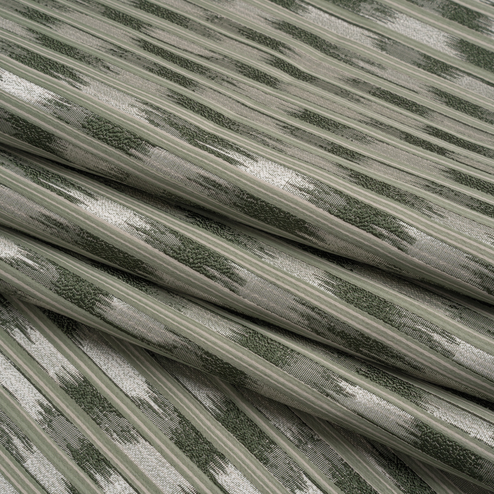 Made with recycled polyester, this Forest Streaking Stripes Drapery Jacquard features a dimensional face, supple drape, and sleek hand that’s perfect for all your window treatment needs!Suggested Projects: Bed Canopies, Curtains, Valances, DrapesContent: 72% Recycled Polyester, 28% PolyesterStretch: NoneOpacity: Mostly OpaqueLet this green and silver Jacquard enchant your home. Rippled green streaks rise from a silver background as striped ribbons line the foreground. Woven on a specific loom, Jacquards yield a sophisticated texture that resembles embroidery—and always evokes elegance. A metallic luster is the final touch of luxury, solidifying this fabric's place in formal dining rooms, elevated living rooms, and mature bedrooms. Slightly transparent; a lining may be desired for complete opacity.