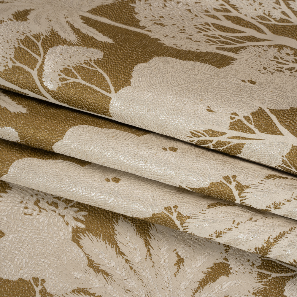 A jungle expands on this Ochre Jungle Trees Drapery Jacquard, yielding a dimensional hand and sleek feel. Made of recycled polyester, it’s as good for the environment as it is for your interiors!Suggested Projects: Bed Canopies, Curtains, Valances, DrapesContent: 70% Recycled Polyester, 30% PolyesterStretch: NoneOpacity: Mostly OpaqueBask in the golden sunset of this yellow and beige Jacquard! The metallic shine of the tropical trees pairs with the lustrous sky for a texture-driven, luxury-focused fabric. Lauded for their sophisticated look, Jacquards constantly deliver a delicious dimension that resembles embroidery, thanks to a specific loom used in production. Light in weight and with a supple drape, this textile is a favorite in formal dining rooms, elevated living rooms, and mature bedrooms. Slightly transparent; a lining may be desired for complete opacity.
