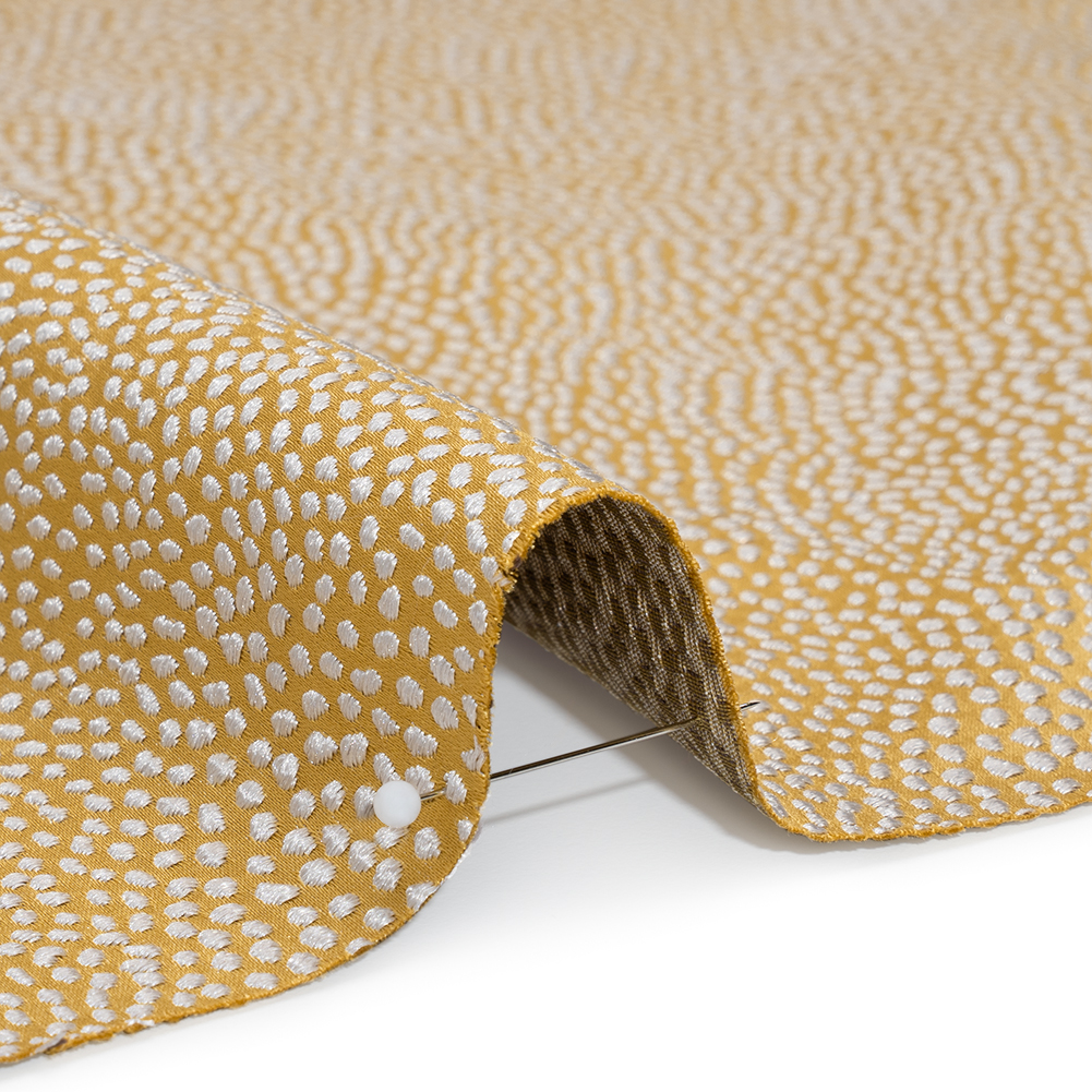 Bring a bit of sunshine into your home with this Buttercup Little All-Over Spots Recycled Polyester Jacquard. With a sleek, tactile hand and slightly structured yet malleable drape, it’s an easy way to introduce texture to your interior.Suggested Projects: Stools, Ottomans, Sectionals, DraperiesContent: 79% Recycled Polyester, 21% PolyesterStretch: NoneOpacity: OpaqueYou’ll want this Jacquard to be all over your home. Little beige spots dot across a buttercup yellow background. Their dimension, recalling the look and feel of embroidery, keeps designers and home sewists alike coming back to Jacquards decade after decade. Thanks to the Jacquard loom, this fabric yields a sophisticated, complex face that applies to upholstery and drapery projects alike. We envision this Jacquard’s slightly structured yet malleable drape and tactile hand becoming sleek bar stools, luxurious sectionals, eye-catching headboards, and billowing drapes. Opaque, a lining is not necessary.