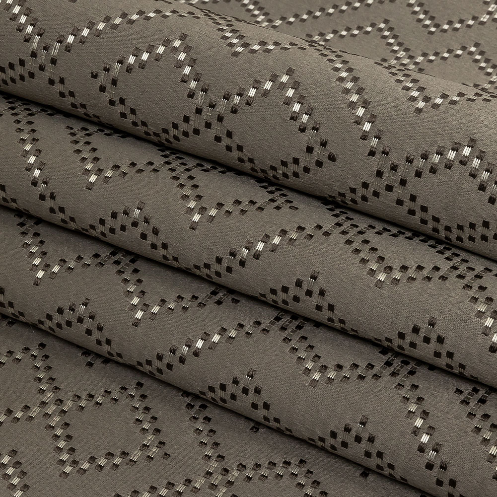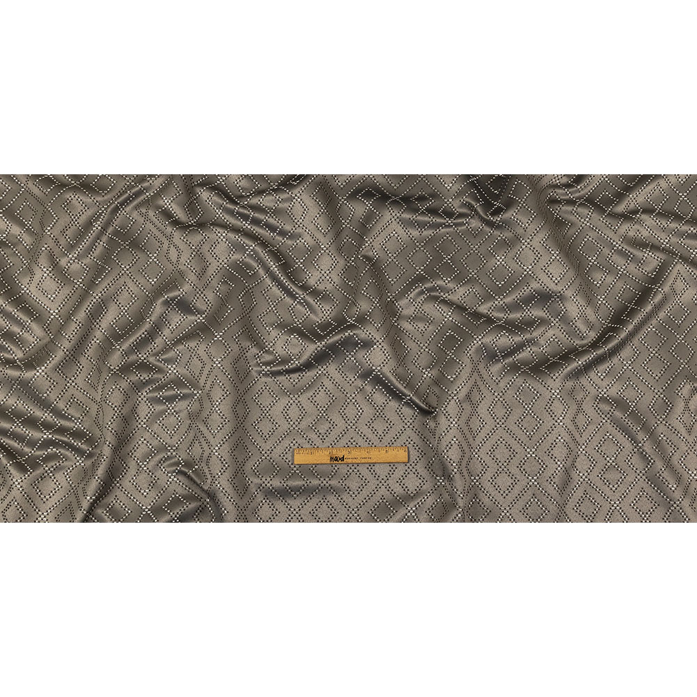 Explore the possibilities of tone-on-tone design with this British Imported Graphite Geometric Diamonds Recycled Polyester Jacquard! Woven warm gray and silver squares form interlocking, luminous diamonds, all over a shiny gray satin-faced ground.