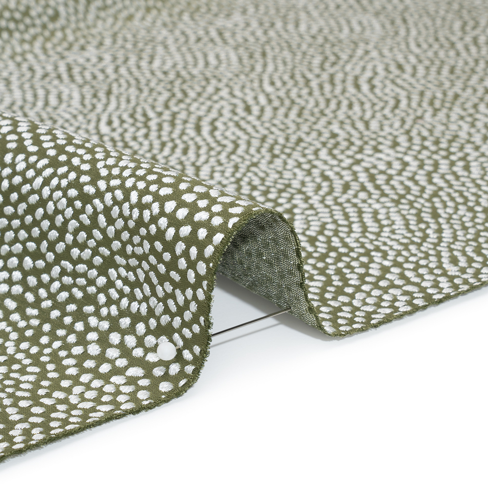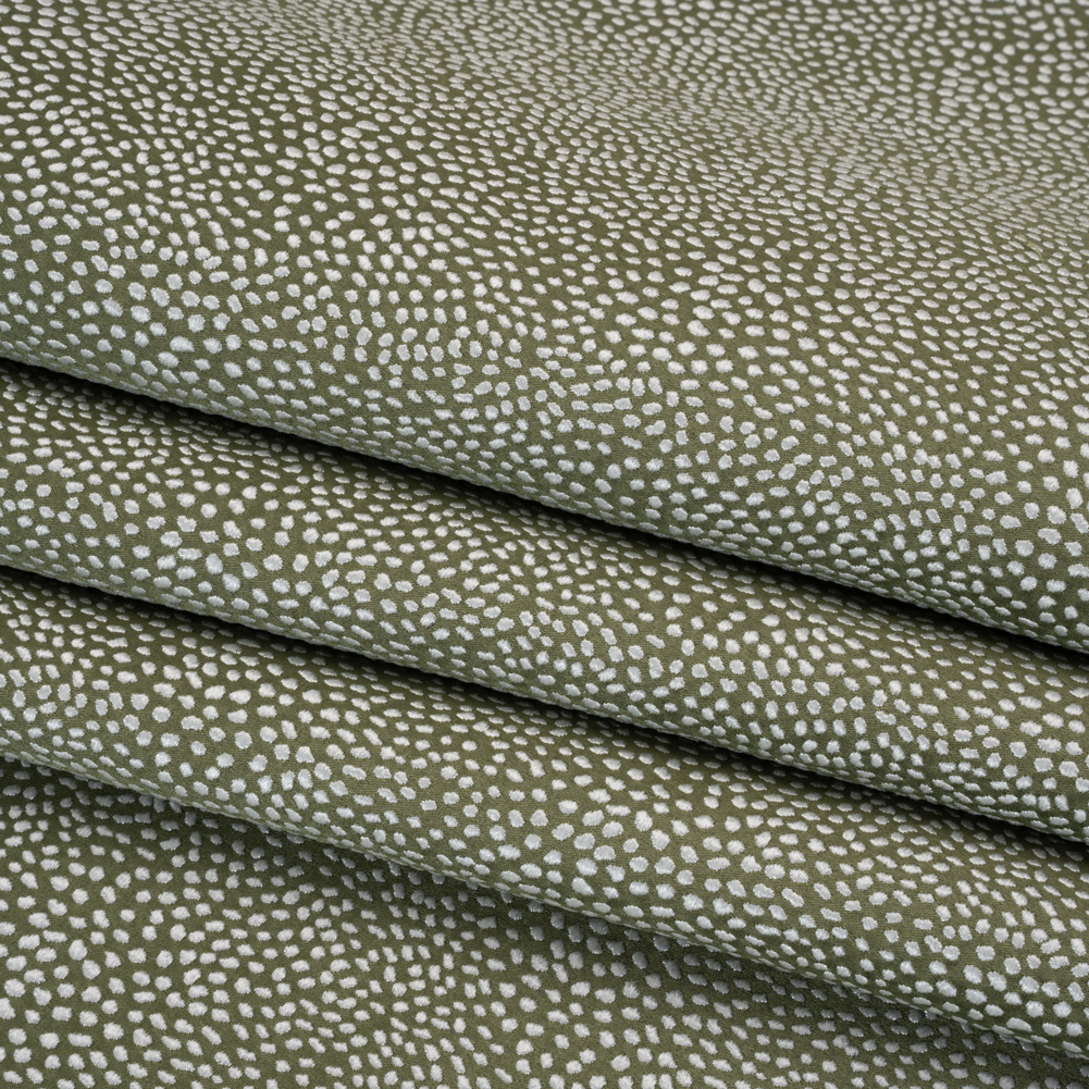Plucked straight from a forest revel, this Moss Little All-Over Spots Recycled Polyester Jacquard will keep the faerie magic going. With a sleek, tactile hand and slightly structured yet malleable drape, it’s an easy way to introduce texture to your interior.Suggested Projects: Stools, Ottomans, Sectionals, DraperiesContent: 79% Recycled Polyester, 21% PolyesterStretch: NoneOpacity: OpaqueYou’ll want this Jacquard to be all over your home. Little white spots dot across a moss green background. Their dimension, recalling the look and feel of embroidery, keeps designers and home sewists alike coming back to Jacquards decade after decade. Thanks to the Jacquard loom, this fabric yields a sophisticated, complex face that applies to upholstery and drapery projects alike. We envision this Jacquard’s slightly structured yet malleable drape and tactile hand becoming sleek bar stools, luxurious sectionals, eye-catching headboards, and billowing drapes. Opaque, a lining is not necessary.